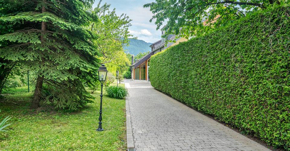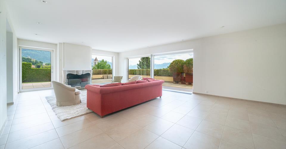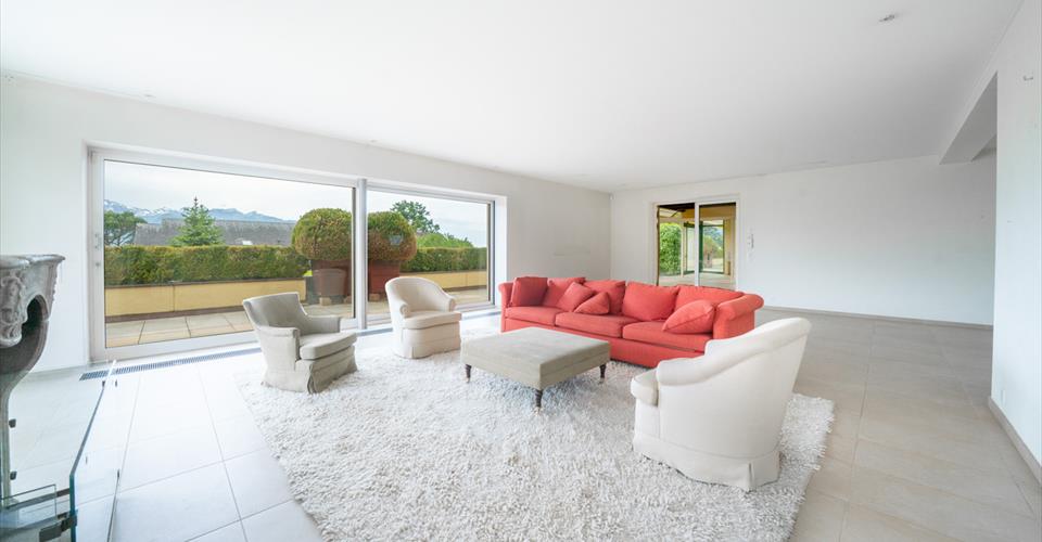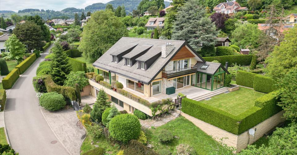 Découvrez cette somptueuse propriété sise au sein d’un cadre idyllique à Saint-Légier, à proximité immédiate de l’École Internationale Bilingue du Haut-Lac. Érigée en 1979 sur une parcelle plate et très privative de 2’727 m², orientée plein sud, cette demeure exceptionnelle jouit d’un ensoleillement optimal tout au long de la journée ainsi que d’une vue panoramique sur le lac Léman et les montagnes environnantes. Rénovée avec soin et matériaux de qualité en 2005 (documentation disponible sur demande), la villa se déploie sur trois niveaux, accessibles via un ascenseur ou un escalier, totalisant environ 350 m² habitables et 590 m² utiles. Deux accès distincts mènent à la propriété : l’un par un garage-box intégré et un studio indépendant, l’autre par une élégante allée aboutissant à l’entrée principale. À l’intérieur, cette résidence séduit par ses volumes généreux, sa luminosité omniprésente et ses finitions haut de gamme, pensées pour offrir un confort de vie absolu. Deux cheminées judicieusement positionnées ajoutent une touche chaleureuse et authentique. Le rez-de-chaussée se distingue par deux vérandas situées de part et d’autre de la maison idéalement placée et dotée de grandes baies vitrées coulissantes permettant de s’ouvrir entièrement sur l’extérieur, créant un espace baigné de lumière du matin à l’après-midi dans une atmosphère en plein air. De ces espaces, vous pourrez admirer les levers et couchers de soleil sans aucun vis-à-vis. Au sous-sol, une magnifique piscine intérieure avec système de nage à contre-courant vous attend, complétée par un espace détente avec douche et WC. Ce niveau abrite également de vastes surfaces de rangement, un garage-box, une chambre à coucher avec sa propre salle de douche, ainsi qu’un espace prévu pour accueillir une superbe cave à vin. À l’étage, trois grandes chambres à coucher vous accueillent, dont une somptueuse suite parentale de 64 m². Chacune bénéficie de sa salle de bains ou salle de douche, garantissant une intimité maximale pour tous les occupants. Deux balcons s’ouvrent sur des vues imprenables sur le lac et les montagnes, pour des réveils tout en douceur. À l’extérieur, un jardin soigné et bucolique entoure la propriété, offrant une multitude de coins paisibles pour se détendre. Ce bel espace offre également un fort potentiel pour l’ajout d’une piscine extérieure, dans un cadre très privatif et ensoleillé. Une opportunité unique d’acquérir une propriété exclusive, alliant élégance, confort et nature dans un emplacement privilégié.