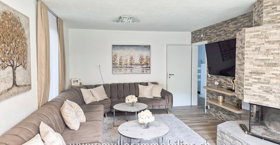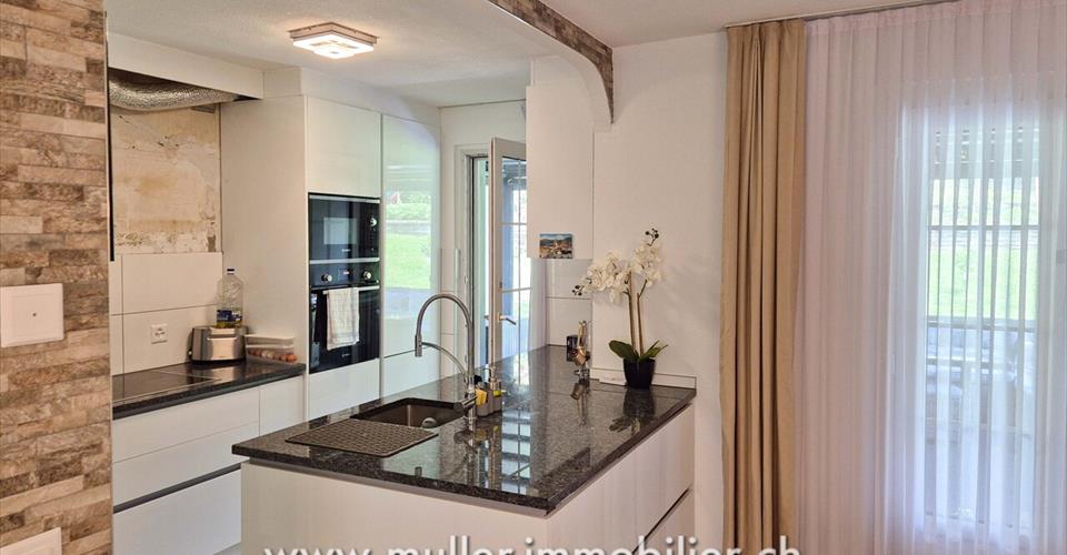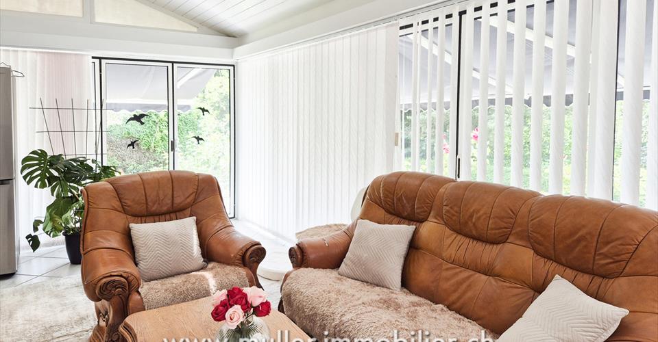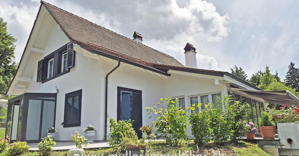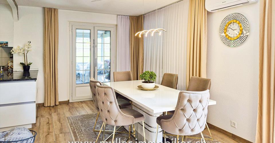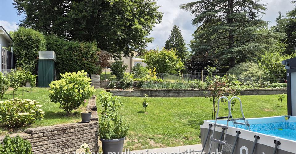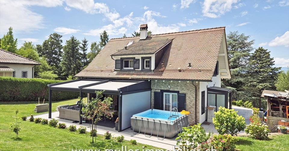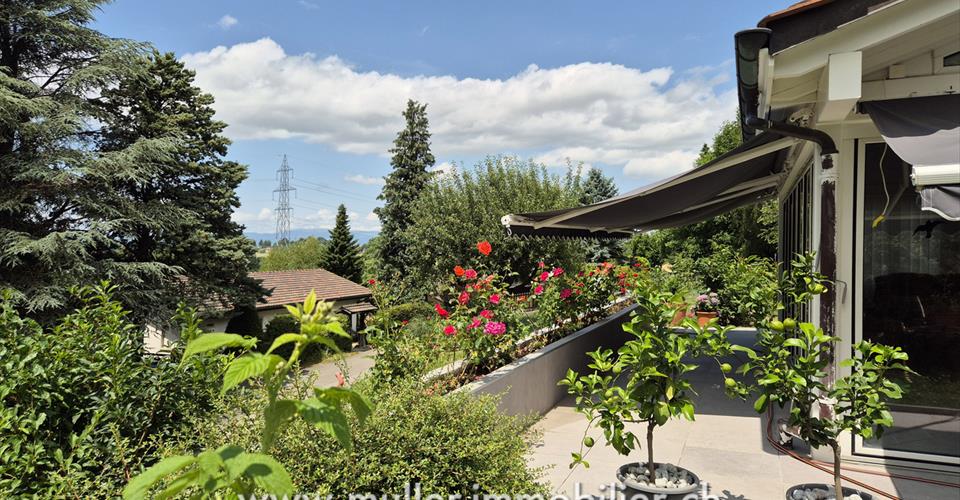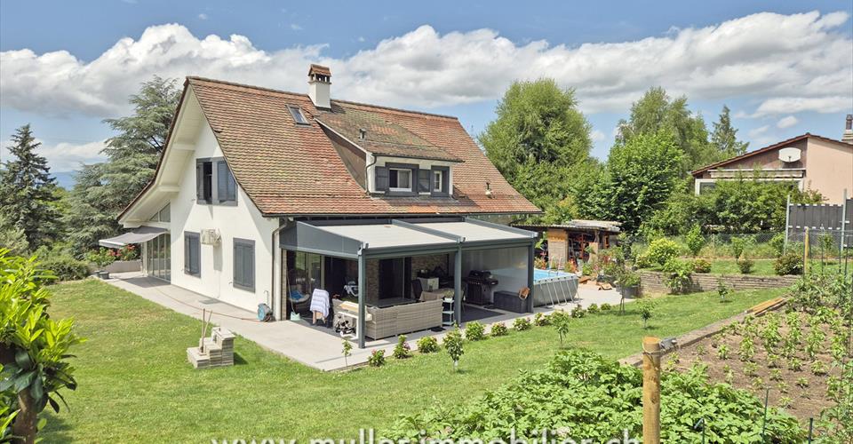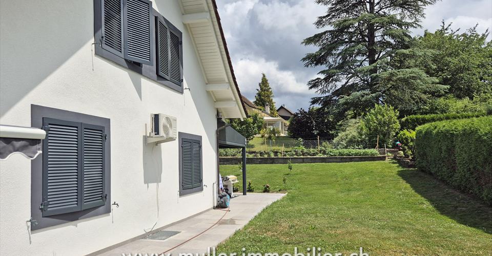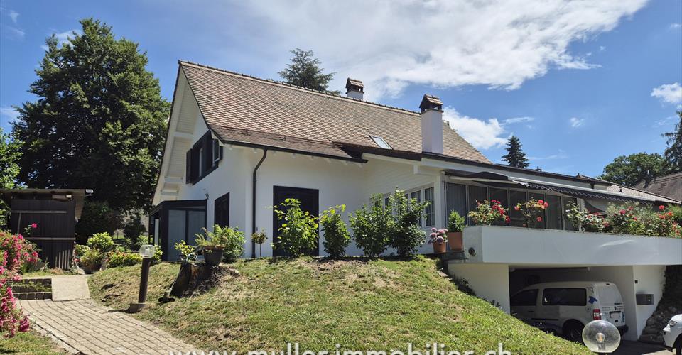 Belle villa de 6,5 pièces entourée de son jardin parfaitement entretenu, plein sud, avec 190 m2 habitables et une parcelle de 1’174 m2. Entièrement rénovée, elle est située à Cugy, dans un quartier calme de villas. À 8 min de l’autoroute du Mont-sur-Lausanne. CONFORT Entourée de verdure Très ensoleillée Parcelle à l’abris des regards Beau jardin parfaitement entretenu Terrasse couverte aménagée Exposition sud Parfaitement rénovée Cheminée au salon Véranda avec cheminée Chauffage au mazout, chaudière changée récemment Garage fermé 5 place de parc Disponibilité : à convenir ACCÈS À 3 min du centre du village À 8 min de l’autoroute (Le Mont) À 11 min d’Echallens À 15 min du CHUV À 15 min de Lausanne centre Transports publics À 5 min à pied de l’arrêt de bus REZ-DE-CHAUSSÉE Hall d’entrée spacieux, une grande pièce à vivre avec cuisine ouverte, salle à manger, salon avec cheminée et accès à la terrasse, une chambre à coucher, salle de douche et WC. Véranda avec cheminée et terrasse couverte au sud. 1ER NIVEAU Trois chambres à coucher, bureau, salle de bain et WC. SOUS-SOL Excavé, pouvant être utilisé pour un studio, salle de jeux ou rangement. AMÉNAGEMENTS EXTÉRIEURS Superbe terrasse couverte au sud, deuxième terrasse à l’ouest, un grand jardin arboré avec potager parfaitement entretenu, le tout sur une parcelle de 1’174 m2 arborée et plane. Grande zone à l’entrée pour parquer, possibilité de parquer 5 voitures. SITUATION Située dans un quartier très calme, accessible par un chemin sans issue, à l’entrée sud de Cugy, accessible parfaitement depuis la sortie d’autoroute du Mont-sur-Lausanne. PARTICULARITÉS La maison a été complètement rénovée en 2024 avec un soin particulier, et est immédiatement habitable sans travaux. Le fabuleux jardin avec potager est le point fort de cette maison, entourant la maison et à l’abri des regards indiscrets. REMARQUE Un îlot de calme et de sérénité, aux portes de Lausanne.