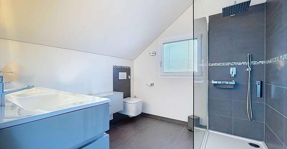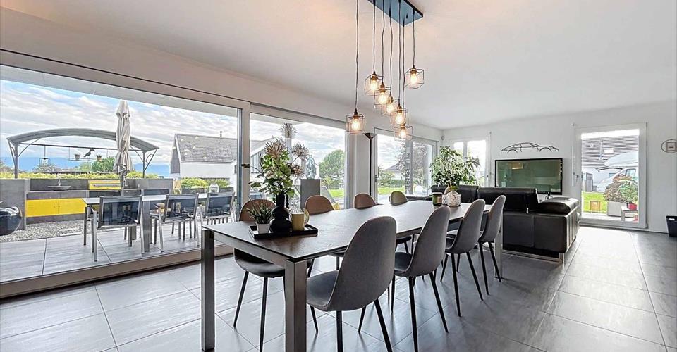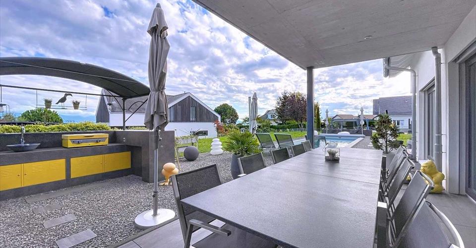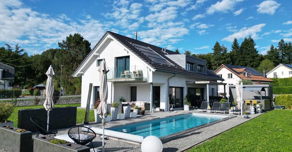 Cette villa moderne se situe dans un quartier résidentiel recherché de Mex, alliant sérénité et facilité d’accès aux commodités. Implantée sur une parcelle de 1’350 m², elle développe 300 m2 utiles (dont env. 220 m2 habitables) répartis sur trois niveaux. Conçue avec des matériaux de qualité et entretenue avec soin, elle séduit par ses volumes généreux et sa luminosité. Le rez-de-chaussée comprend une cuisine contemporaine avec cellier attenant et un vaste séjour ouvert sur la terrasse et le jardin. Une chambre ou bureau ainsi qu’une salle de bain avec douche complètent cet étage. À l’étage, trois chambres s’ajoutent à une suite parentale avec salle de bain privative (baignoire et douche), une seconde salle de bain et une pièce supplémentaire pouvant être aménagée en quatrième chambre. Le sous-sol offre un espace modulable selon vos besoins – salle de jeux, home cinéma ou autre – ainsi qu’une salle de sport, un atelier, un local technique et une cave à vins. À l’extérieur, le jardin paysager constitue un prolongement naturel de la maison. La piscine chauffée, deux terrasses bien orientées et une cuisine d’été équipée invitent aux moments de détente et de convivialité. Deux cabanons complètent l’aménagement, tandis qu’un garage double avec borne de recharge, un carport couvert et plusieurs places de stationnement assurent un confort pratique au quotidien. Cette villa moderne est une opportunité rare, conjuguant confort, espace familial et situation privilégiée face au Léman et aux Alpes.