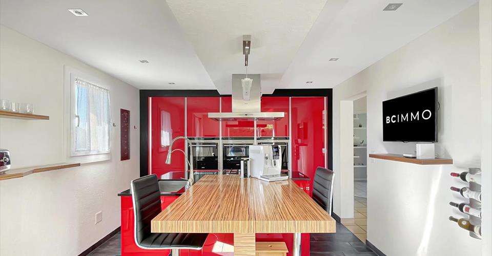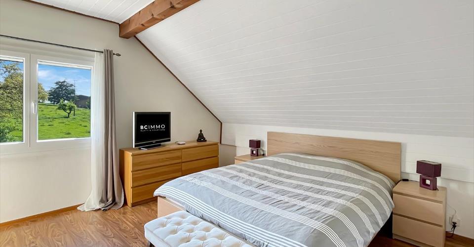 BC IMMO vous présente en exclusivité, une magnifique villa individuelle située dans un cadre bucolique à Chesalles-sur-Moudon (commune de Lucens). Au coeur de la campagne vaudoise, cette villa individuelle offre un cadre de vie paisible et verdoyant. Équipée d’une pompe à chaleur, elle séduit par ses volumes généreux et ses aménagements soignés. Rez-supérieur : Un hall de distribution dessert une salle de douche avec wc ainsi qu’une pièce polyvalente pouvant servir de chambre, bureau ou dressing. La cuisine, moderne et très bien équipée, est dotée d’un agréable coin repas. Le séjour, lumineux et convivial, s’articule autour d’un espace salle à manger ouvert sur le salon, lui-même agrémenté d’une cheminée d’angle. De grandes baies vitrées assurent un accès direct aux terrasses et au jardin. Étage : L’étage accueille une grande salle de bain et quatre chambres. Rez-inférieur : Ce niveau abrite un vaste garage pour trois véhicules, un local technique, une grande buanderie équipée ainsi qu’une cave. Un espace brut, prêt à être aménagé, permet la création d’un studio indépendant ou d’un local commercial selon vos besoins. Extérieurs : Deux terrasses orientées sud et est permettent de profiter pleinement de la lumière et de la tranquillité environnante. Le jardin, joliment arboré, s’étend autour de la maison et offre plusieurs espaces de détente. Cinq places de stationnement extérieures complètent les prestations.