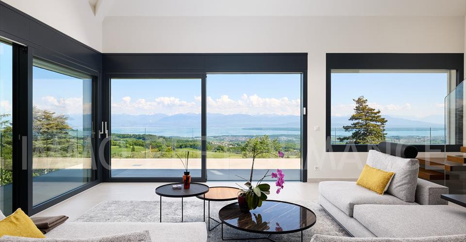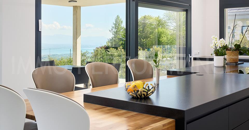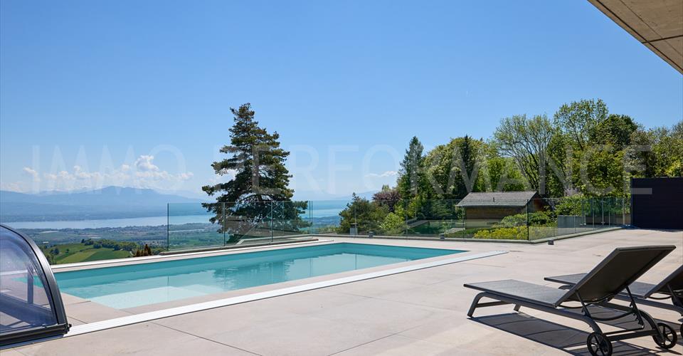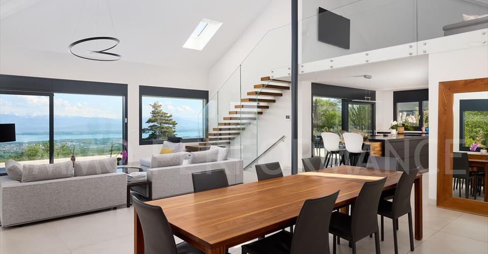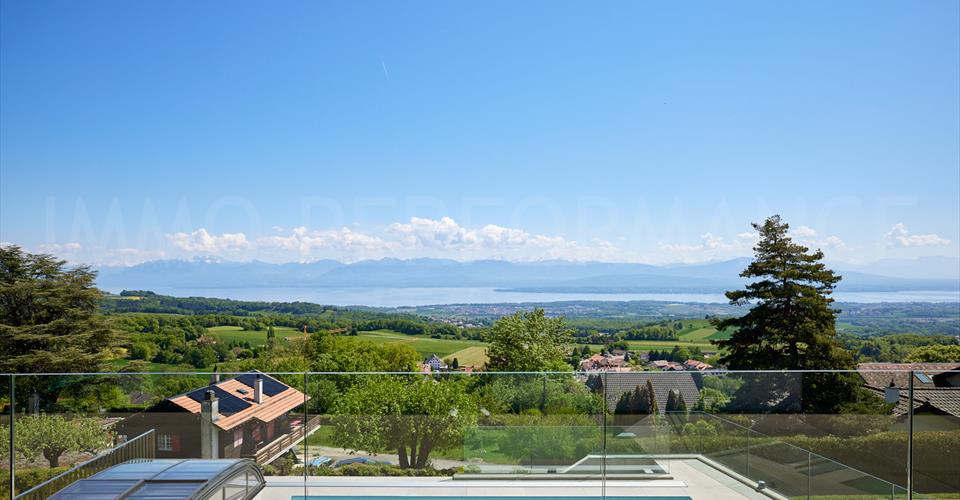 Superbe villa contemporaine récente à l’état de neuf sur le hauteurs du bassin lémanique, à 15 min de Nyon et l’accès autoroutier. Construite avec le plus haut niveau d’exigence, cette villa a fait l’objet d’une attention toute particulière : Vue, lumière, confort et praticité. Offrant plus de 450 m2 utiles sur 4 niveaux, le sens du détail est saisissant à tous les étages. Le volumineux espace de séjour-salle à manger de près de 70 m2 vous offre un paysage spectaculaire permanent. Les terrasses des différents niveaux vous invitent à la détente et à la contemplation. Ce bien rare offre 4 chambres à coucher, dont une suite parentale de 40 m2 incluant dressing et salle de bain privative. Sous-sol complet, isolé et chauffé, avec pièce polyvalente de 56 m2 et accès au garage. Garage pour 3 voitures + espace motos/vélos/atelier et grand parking extérieur.
