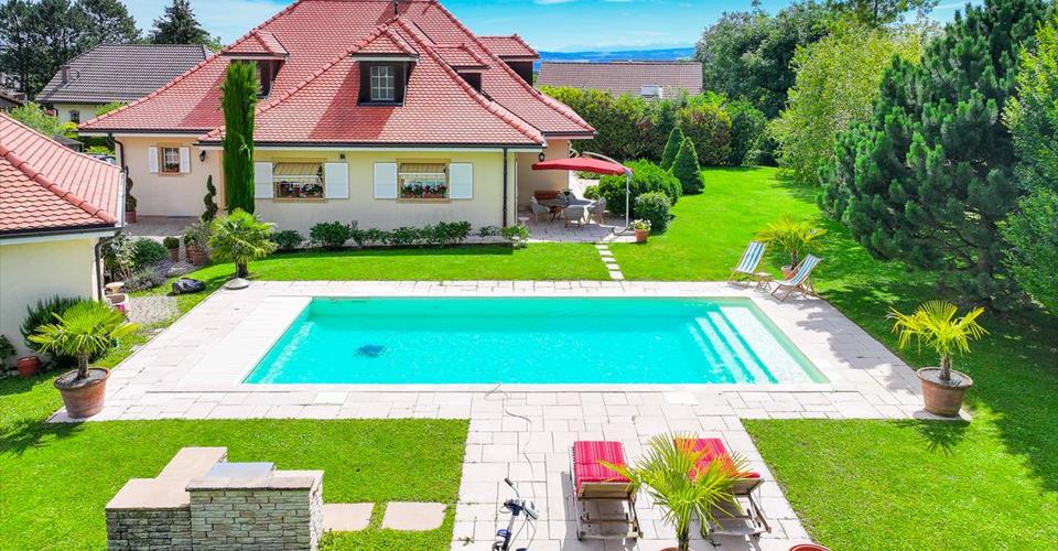 Opportunité Unique! Cette magnifique propriété est située dans un quartier paisible de Rances, offrant à ses résidents une atmosphère de tranquillité et de sérénité. Construite en 2002, la villa se distingue par son design moderne et ses finitions de qualité supérieure. Avec 5 chambres spacieuses, une grande cuisine habitable entièrement agencée avec un plan de travail en granit, 2 salles de bains élégantes, un wc visiteurs, un dressing proche de l’entrée, une pièce à repasser et un vaste séjour avec cheminée, cette maison est parfaite pour des personnes en quête de confort et d’espace. Le grand jardin magnifiquement arboré comprend une piscine avec balnéothérapie et la nage à contre-courant. Le sous-sol est entièrement excavé et comprend de nombreux espaces de rangement ainsi qu’à l’étage où se trouve une pièce dite ‘grenier’. De plus, il reste un potentiel sur la parcelle de construction supplémentaire d’env. 140 m2. Les points forts : 5 Chambres spacieuses Surface habitable de 292 m² 2 Salles de bains, wc, lavabo ainsi qu’un wc visiteurs Terrain de 1792 m² Garage double et multiples places de parking extérieures Piscine avec balnéothérapie et nage contre-courant Cheminée pour des moments de détente inoubliables Chauffage écologique grâce à une pompe à chaleur L’entrée d’autoroute se trouve à 5 minutes et vous rejoindrez les grandes villes telles que Lausanne en 25 minutes ainsi que l’aéroport de Genève en 45 minutes. Unique Opportunity! Charming architect-designed villa of 6.5 rooms This magnificent property is located in a peaceful area of ??Rances, offering its residents an atmosphere of tranquility and serenity. Built in 2002, the villa stands out for its modern design and top quality finishes. With 5 spacious bedrooms, a large fully fitted kitchen with a granite worktop, 2 elegant bathrooms, a guest toilet, a dressing room close to the entrance, an ironing room and a large living room with fireplace, this house is perfect for people looking for comfort and space. The large, beautifully wooded garden includes a swimming pool with balneotherapy and counter-current swimming. The basement is completely excavated and includes numerous storage spaces as well as upstairs where there is a room called the ‘grenier’. In addition, there remains potential on the additional construction plot of approx. 140 m2. The strong points : 5 spacious bedrooms Living area of ??292 m² 2 bathrooms, toilet, sink and a guest toilet Land of 1792 m² Double garage and multiple outdoor parking spaces Swimming pool with balneotherapy and counter-current swimming Fireplace for unforgettable moments of relaxation Ecological heating thanks to a heat pump The expressway entrance is 5 minutes away and you can reach major cities such as Lausanne in 25 minutes as well as Geneva airport in 45 minutes.