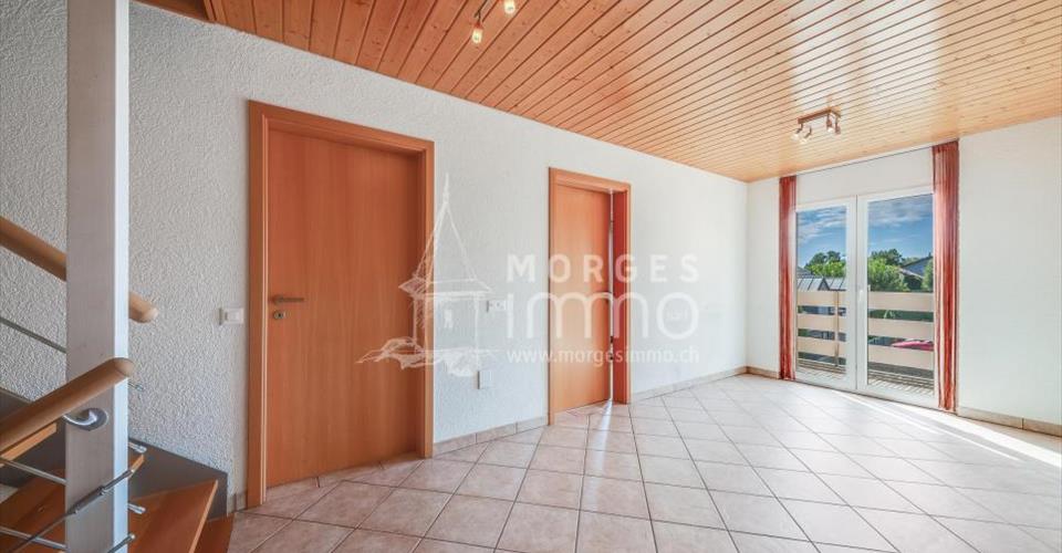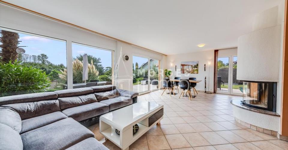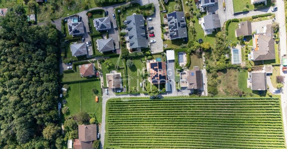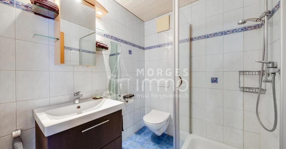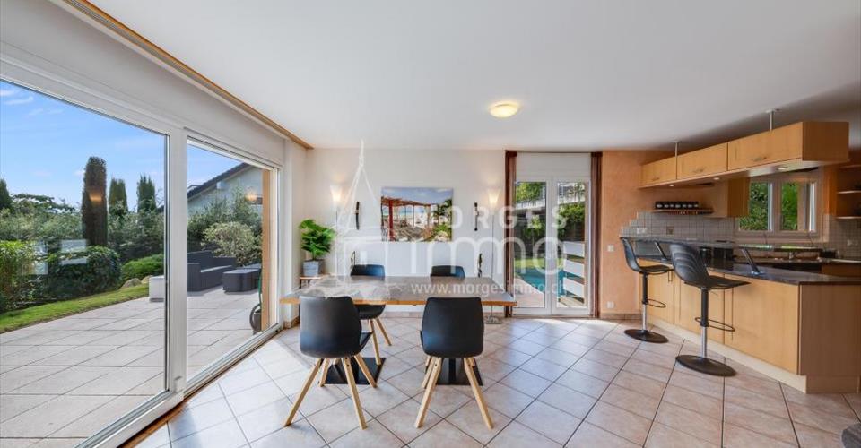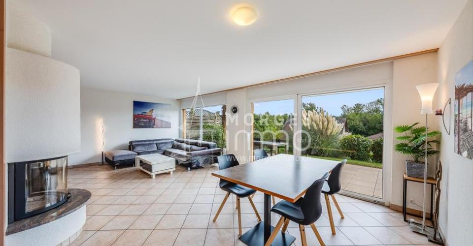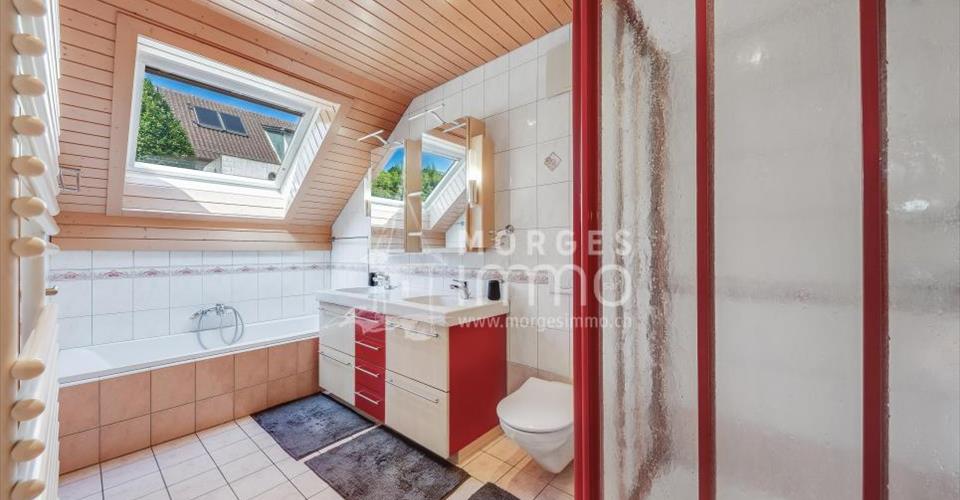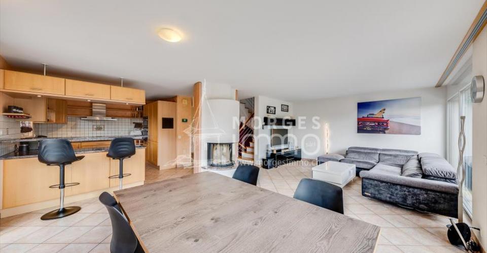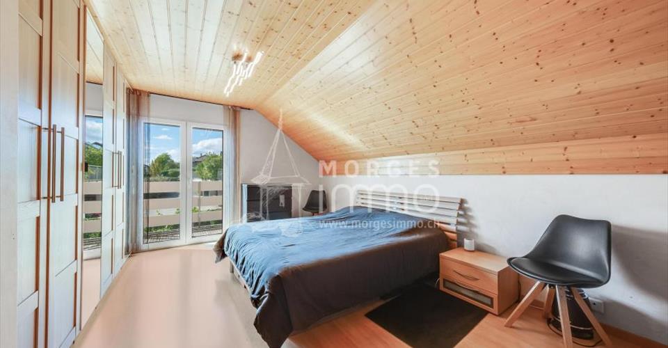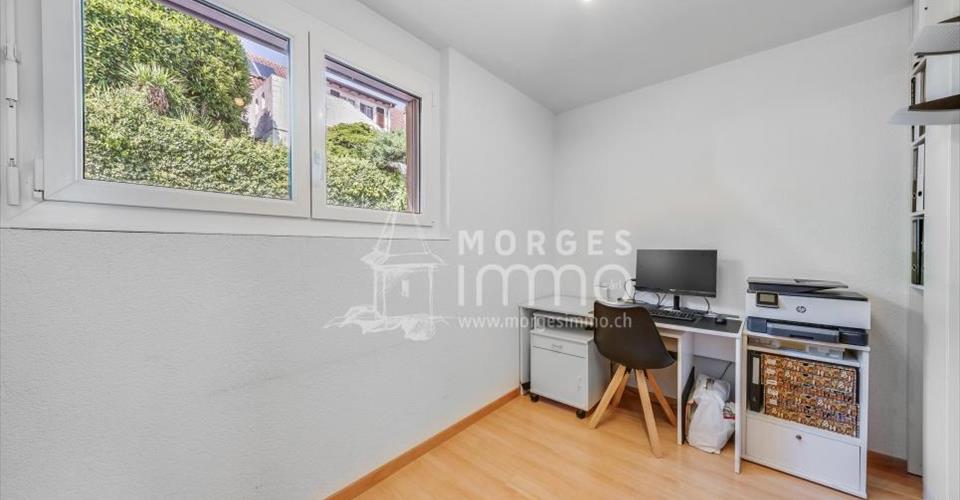Villa jumelle unique sise sur une parcelle individuelle à St-Prex, dans un quartier résidentiel recherché, elle vous séduira par son emplacement idéal, à proximité immédiate de toutes les commodités. Son environnement calme et verdoyant, combiné à une excellente performance énergétique (note globale A), en font un bien rare sur le marché! Avec ses trois niveaux d’habitation et son sous-sol, cette propriété vous séduira par ses volumes généreux et sa distribution: Sous-sol: Hall de d’entré agréable avec accès direct depuis l’extérieur Local technique bien pensé avec buanderie intégrée (environ 15 m²) Abri PC local de rangement (environ 14 m²) Atelier spacieux (environ 14 m²) Grand local de rangement (environ 15 m²) WC visiteurs sous l’escalier Rez-de-chaussée: Hall de dégagement accueillant avec armoires intégrées Bureau lumineux ou pièce polyvalente Salle d’eau avec douche, WC et lavabo Grande cuisine entièrement équipée et ouverte sur l’espace de vie Salle à manger avec accès direct sur la terrasse orientée sud-ouest Séjour chaleureux avec cheminée centrale et accès sur la terrasse puis le magnifique jardin arborisé Etage: Important hall de dégagement avec accès au balcon orienté sud-ouest Spacieuse suite parentale (environ 18 m²) avec accès au balcon Salle d’eau complète avec baignoire, douche, WC et double vasque Deux chambres confortables d’environ 14 m² chacune, dont l’une bénéficie d’un accès unique au balcon Combles: Combles aménagés avec soin, offrant environ 27 m² de surface au sol, idéal pour une salle de jeux, un bureau, ou une chambre d’invité Extérieurs: Couvert pour deux véhicules avec local de rangement attenant et prééquipé pour borne de charge électrique Une place de parc extérieure Magnifique jardin arborisé Deux belles terrasses idéalement orientées Bénéficiant d’une transition énergétique récente (2024), cette villa est équipée d’une pompe à chaleur géothermique et de 32 panneaux photovoltaïques – pour un confort optimal et des charges réduites.