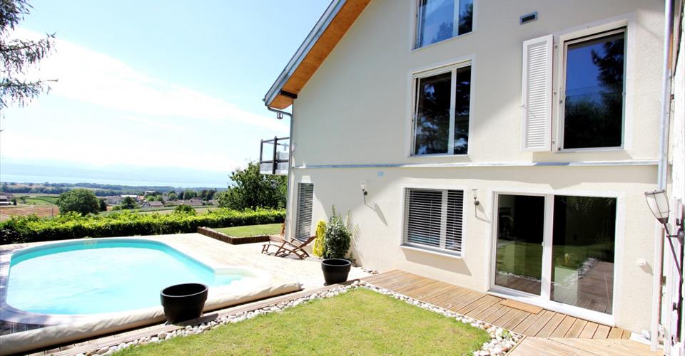 Cette charmante villa de 61/2 pièces, érigée dans un écrin de verdure au coeur de la Côte, surplombant l’arc lémanique, offre une vue imprenable sur le lac Léman, la chaîne des Alpes ainsi que le Mont-blanc. Proche des commodités, Morges, Rolle, Lausanne, aéroport de Genève, des écoles, garderie, commerces, ainsi que du petit train de campagne avec de très bonnes connections pour accéder très rapidement dans toute la Suisse, est un confort de vie. La conception de cette villa, est principalement en bois avec à l’intérieur des rondins et des pierres, ce qui confère un esthétisme rustique et authentique. Des panneaux solaires thermiques sont intégrés sur le toit, prise pour voitures électriques, de grandes fenêtres triples vitrages, ainsi que des velux grands formats en toiture maximisent l’entrée de la lumière naturelle. La pompe à chaleur de haute qualité, diffuse la chaleur par les sols. Construite sur trois étages, le rez supérieur offre un grand séjour avec cheminée avec accès à la terrasse par de grandes baies vitrées, une cuisine américaine agencée, un sellier, une salle à manger, un wc visiteurs avec une vasque en pierre massive, un sas d’entrée. Au rez inférieur il y a trois chambres dont deux communicantes avec une salle de bain, et la 3ème chambre avec sa salle de douche à l’italienne, une grande pièce multi usages, local technique, buanderie. Au 1er étage sous les combles, une suite parentale avec son dressing, sa salle d’eau avec la combinaison d’une douche à l’italienne et d’une baignoire, deux belles vasques en pierre. Toutes les chambres de la villa ont une vue imprenable sur le lac et les Alpes. Les extérieurs sont composés d’un jardin engazonné avec arrosage automatique, arboré et illuminé avec une piscine chauffée, plusieurs terrasses et des parkings, complètent se bien-fonds d’exception. Ses atouts: proches des commodités, économie d’énergie, vue imprenable.