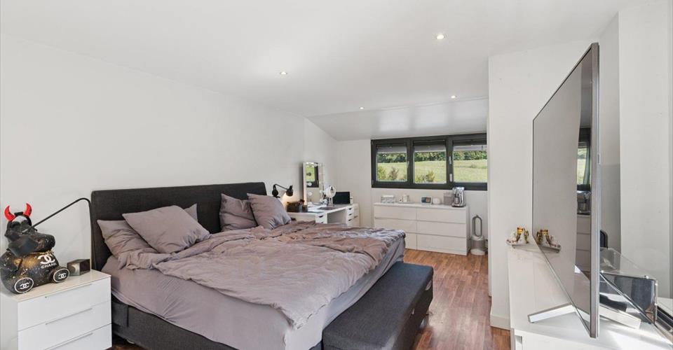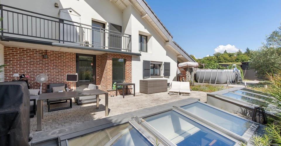 Située à Bernex, au lieu-dit « Chèvres », cette ravissante maison de village profite d’un cadre résidentiel recherché, alliant calme, verdure et proximité immédiate de Genève. Nichée au sein d’un ancien corps de ferme, cette maison, entièrement rénovée en 2014, se divise en deux logements sous le régime PPE. Elle profite d’une généreuse surface PPE de 248 m² ainsi que d’un balcon de 7 m² répartis sur quatre niveaux. Ce bien rare séduit par ses volumes, sa luminosité et ses prestations de qualité. Distribution intérieure : Rez-inférieur : cuisine moderne ouverte sur un vaste séjour/salle à manger baigné de lumière grâce aux verrières motorisées avec capteurs de pluie, buanderie, réduit et carnotzet actuellement aménagé en chambre à coucher avec salle de bains attenante. Rez-de-chaussée (niveau de l’entrée) : grand hall d’entrée agrémenté de nombreux placards intégrés, WC visiteurs avec espace rangements ainsi qu’une chambre à coucher avec salle d’eau privative. Premier étage : superbe suite parentale avec salle de douche complète et accès au balcon orienté Sud-Est. Combles : troisième chambre à coucher avec salle de douche attenante. À cela s’ajoute une magnifique terrasse prolongée par un jardin joliment arboré et aménagé, offrant une surface totale de 229 m², idéal pour profiter des beaux jours en toute tranquillité. La maison dispose également de 3 places de parking privatives ainsi que de nombreux emplacements visiteurs. Ce bien rare est une opportunité idéale pour une famille en quête d’espace, de confort et d’authenticité, à seulement quelques minutes du centre de Genève. A visiter sans tarder ! Calculs de pondération : Sous-sol : 107 m² à 50% ? 53,50 m² Rez-de-chaussée : 61 m² à 100% ? 61 m² 1er étage : 55 m² à 100% + balcon de 7 m² à 50% (3,50 m²) ? 58,50 m² Combles : 25 m² à 50% ? 12,50 m² Jardin / terrasse : 229 m² à 10% ? 22,90 m² Total surface pondérée : 208,40 m²
