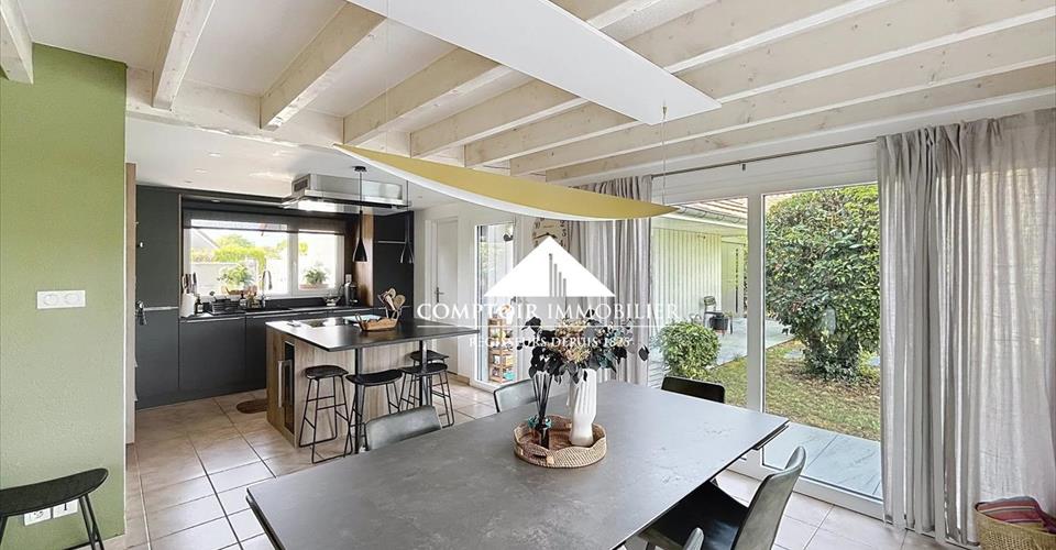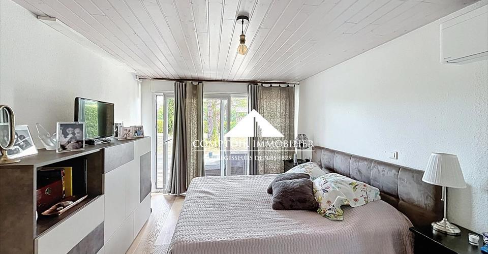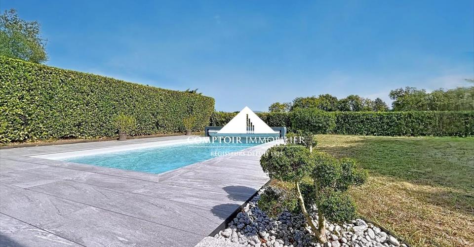 VILLA SITUEE A 3 KM DE LA DOUANE D’HERMANCE Découvrez cette superbe villa de 190 m² utiles idéalement située à Chens-sur-Léman, dans un quartier calme proche de la frontière Suisse et de toutes les commodités. Entièrement rénovée, cette maison bénéficie d’un terrain plat de plus de 1’000 m² avec piscine et garage. La maison propose au rez-de-chaussée: une entrée avec wc visiteurs, un salon-salle à manger spacieux et lumineux, une cuisine équipée, une buanderie, une master bedroom avec salle de bains. À l’étage, la maison propose 3 autres chambres, une mezzanine, une salle de bains et wc séparés. L’accès de la maison est sécurisé par un portail électrique. Un grand garage et un carport complètent avantageusement l’ensemble. A visiter sans tarder.