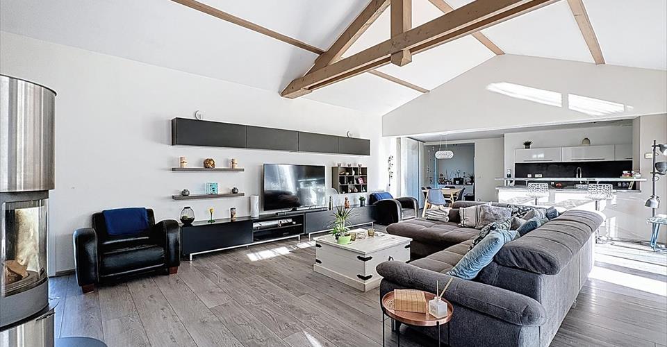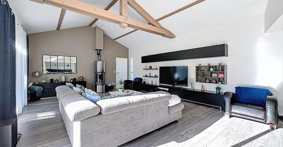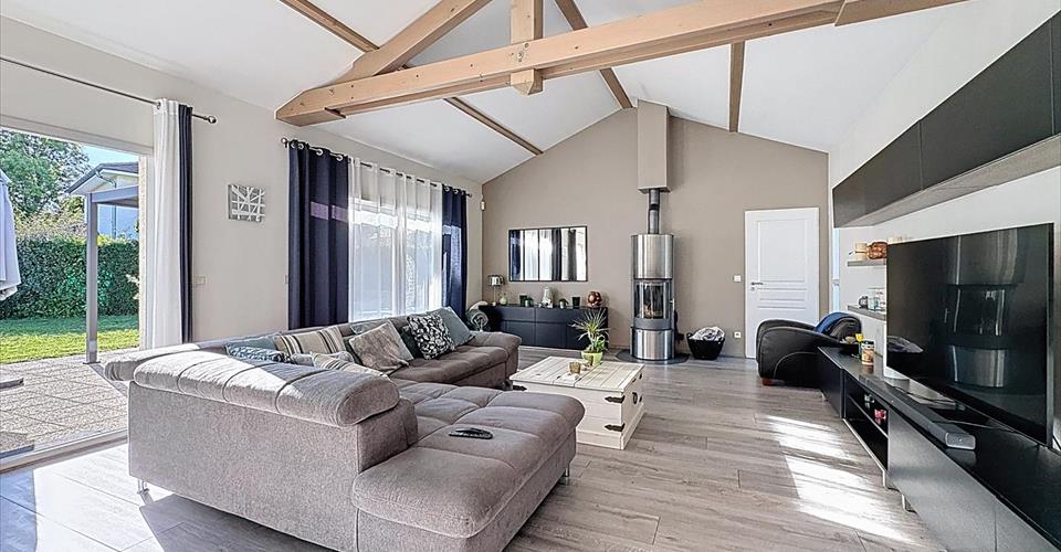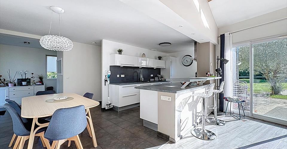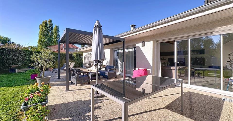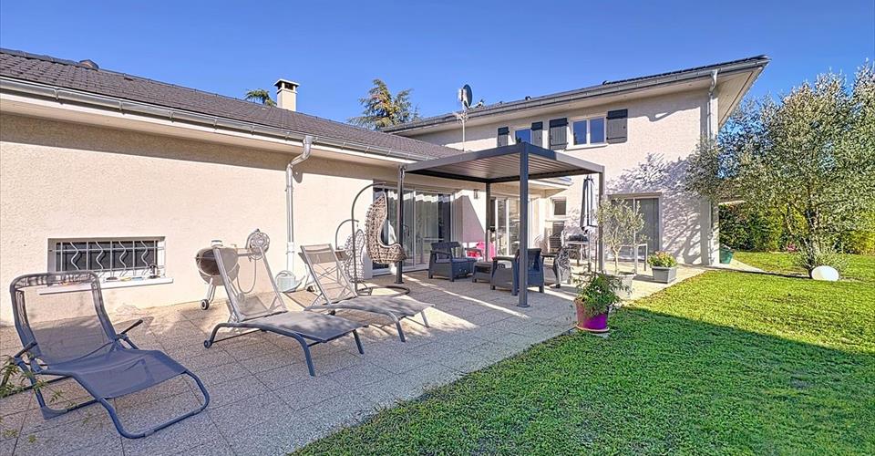 L’Agence Rive Gauche vous propose en exclusivité à Chens-sur-Léman (FRANCE), cette magnifique villa d’architecte de 152m2 habitables pour 241utiles édifiée en 2011 sur un terrain de 1674m2. Elle se compose d’une entrée avec penderie et wc indépendant donnant sur un espace de vie offrant une cuisine entièrement équipée avec table bar ouverte sur l’espace salle à manger/séjour agrémenté d’un poêle à bois, cette pièce de vie de 57m2 offre de très beaux volumes de par son architecture avec plafond cathédrale et profite d’une belle luminosité naturelle grâce aux ouvertures sur la terrasse qu’elle dispose. Nous trouvons également au rez-de-chaussée un espace parentale avec dressing, salle de bain + douche et wc. A l’étage la maison offre 4 chambres supplémentaires et une salle de bain avec wc. Au sous-sol aménagé : une pièce home cinema, poss salle de jeux ou de sport, une buanderie avec point d’eau, une pièce de rangement et un accès au vide sanitaire idéal pour servir de cave. A l’extérieur la maison profite d’une terrasse d’environ 90m2 exposée Sud-Ouest le terrain est piscinable et entièrement clos par une haie végétale, 2 portillons donnent accès à la maison et au jardin. Coté stationnement, un grand garage de 34,76m2 avec accès direct à l’habitation ainsi que 4 places de parking.A visiter sans tarder !