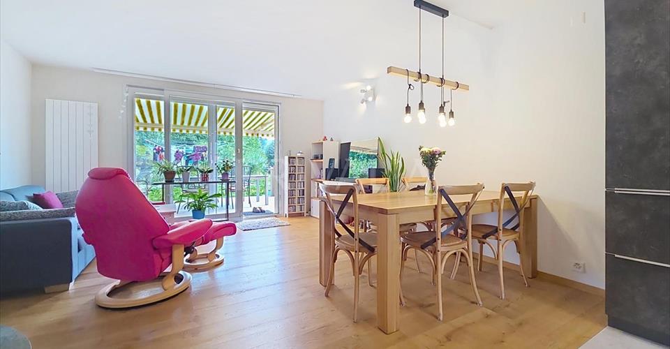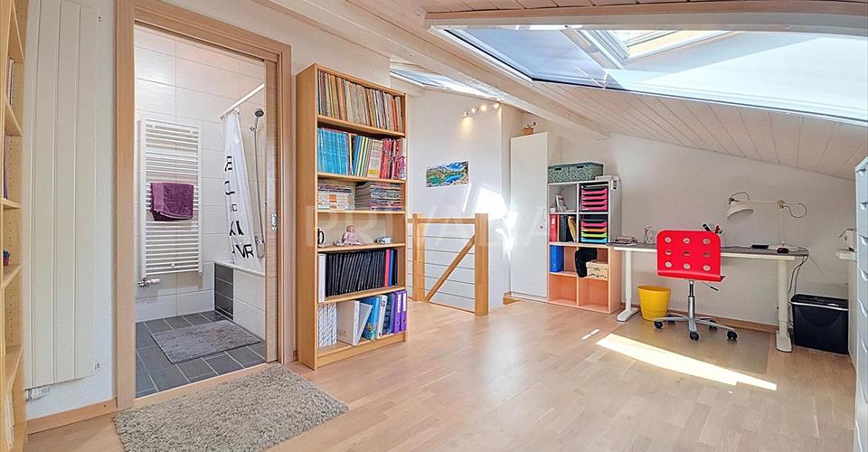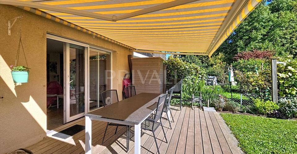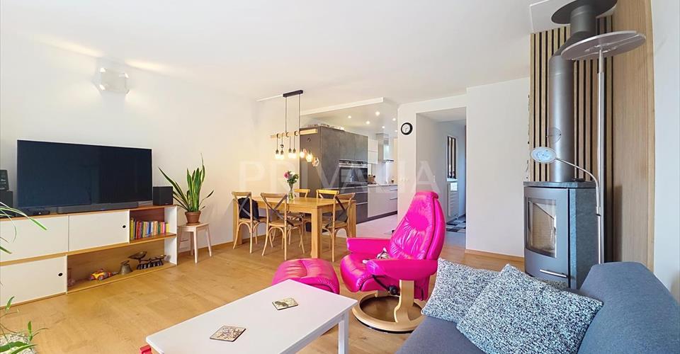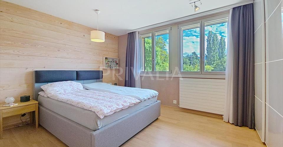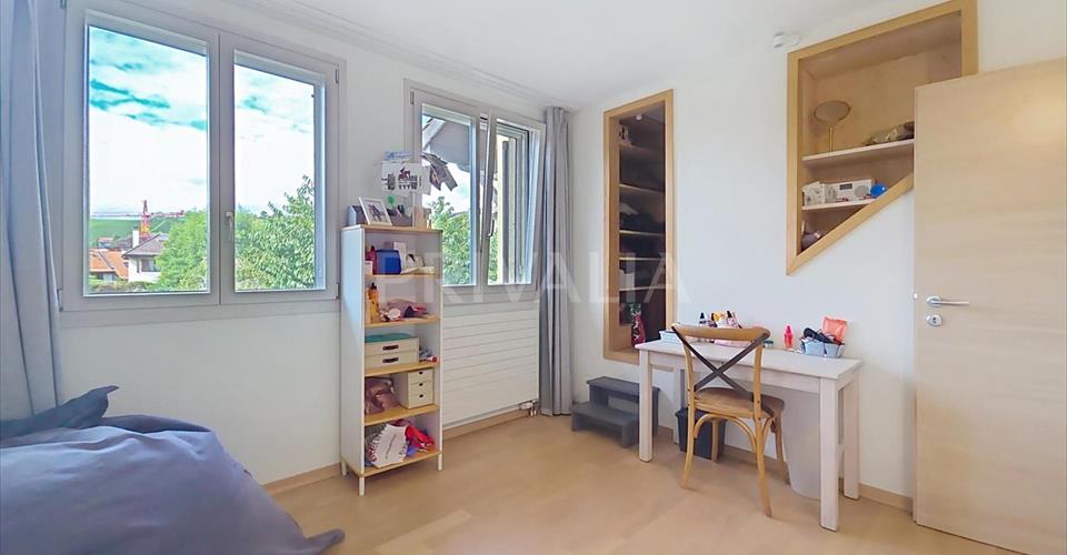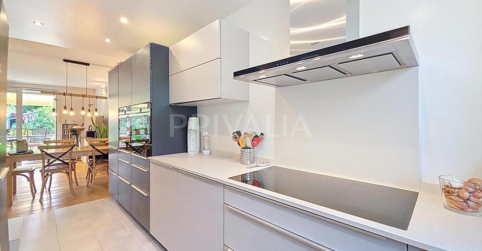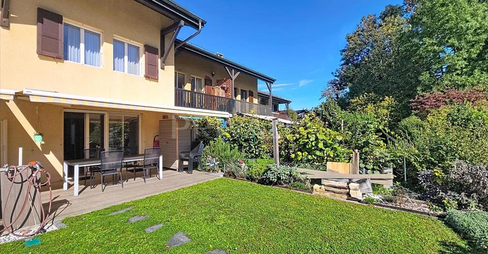Située à Lully, sur la commune de Bernex, cette charmante maison villageoise rénovée est répartie sur trois niveaux (rez, 1er étage et combles) + sous-sol et offre une surface habitable d’environ 115 m2 (environ 140 m2 utiles). Au sein d’un charmant ensemble villageois composé de villas et d’appartements, elle profite d’espaces de vie harmonieux et bénéficie de prestations de qualité telles qu’une cuisine contemporaine entièrement équipée et agencée avec un four à vapeur, d’un poêle, de multiples rangements, de moustiquaires sur toutes les fenêtres, de combles aménagées et chauffées ainsi que d’une terrasse et d’un petit jardin privatif orienté est prolongé par un espace extérieur aménagé en grand potager. Elle se distribue comme suit : Rez-de-chaussée : – Hall d’entrée avec vestiaire – Séjour / salle à manger avec poêle et accès terrasse et jardin – Cuisine ouverte agencée et équipée – WC visiteurs 1er étage : – Chambre avec petit dressing – Vaste chambre à coucher avec placards – Salle de douche avec WC Combles aménagées : – Pièce polyvalente (bureau, petit salon, salle de jeux, etc.) – Chambre à coucher – Salle de bains avec WC Sous-sol : – Garde-manger – Buanderie avec évier (à équiper) – Garage (pouvant être utilisé comme atelier ou comme garage) – Une cave Chaudière à pellets partagée avec la villa voisine. La villa est équipée de panneaux solaires. Une place de parking en sous-sol complète l’ensemble ainsi qu’un grand potager avec un abris de jardin. Dans un environnement calme, cette maison profite d’une situation idéale et tranquille, idéale pour une famille, offrant également un jardin et une dalle commune au lotissement. Le bord de l’Aire est accessible à quelques minutes à pieds et offre des magnifiques balades. L’école primaire de Lully-Sézenove se situe à quelques minutes à pieds. A proximité de l’ensemble des commodités (transports en commun, restaurants, commerces notamment), à moins de 20 minutes du centre-ville de Genève et à quelques minutes des axes routiers et autoroutiers. Provisions pour charges de chauffage, eau chaude et frais de maintenance à 250.- / mois.