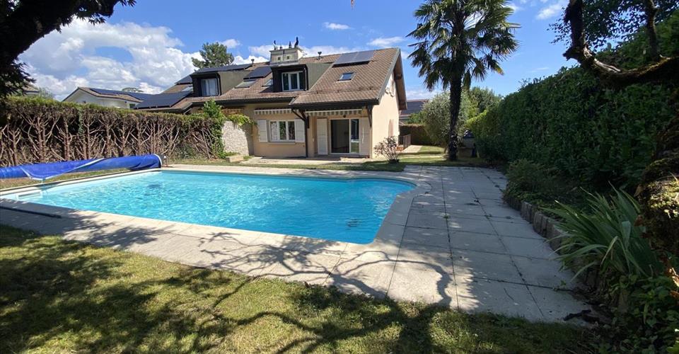 Découvrez cette élégante maison mitoyenne, située au calme au fond d’une impasse dans un quartier résidentiel très recherché de Genthod. Parfaite pour une famille, elle offre un cadre de vie paisible et verdoyant, avec son jardin agrémenté d’une piscine et un studio avec accès indépendant. Au rez-de-chaussée, un grand hall d’entrée avec placard, WC visiteurs, donnant accès à une cuisine entièrement équipée et ouverte sur un vaste et lumineux séjour équipé d’une cheminée. L’espace de vie de 50 m2, s’ouvre directement sur la terrasse, le jardin, ainsi que la piscine. À l’étage, une suite parentale spacieuse avec sa salle de bain privative. Deux chambres supplémentaires, et une seconde salle de bain. Au rez-inférieur, un studio indépendant avec entrée séparée, comprenant une chambre, une salle de douche et une kitchenette, idéal pour accueillir des invités, un adolescent ou pour un usage professionnel. Ce niveau inclut également une buanderie, une cave et un local technique, offrant des espaces de rangement et de commodité. À l’extérieur, profitez d’un jardin entièrement clos et d’une terrasse ensoleillée avec piscine. Pour votre stationnement, la propriété dispose d’un garage fermé et d’une place de parking extérieure. Loyer mensuel : CHF 6’000.? Forfait d’entretien du jardin et de la piscine : 330 .- par mois Charges individuelles. Pour plus d’informations ou pour organiser une visite, veuillez contacter M. Timothy BENOIT à ou par téléphone Superb House with Swimming Pool and Separate Studio in Genthod Discover this elegant semi-detached house, located in a quiet cul-de-sac in a highly sought-after residential area of Genthod. Perfect for a family, it offers a peaceful and green living environment, with a garden featuring a swimming pool and a studio with separate access. On the ground floor, there is a large entrance hall with a closet and guest toilet, leading to a fully equipped kitchen that opens onto a spacious and bright living room with a fireplace. The 50 m² living area opens directly onto the terrace, garden, and the swimming pool. Upstairs, there is a spacious master suite with its own private bathroom. Two additional bedrooms and a second bathroom. On the lower ground floor, there is a separate studio with its own entrance, comprising a bedroom, a shower room, and a kitchenette, ideal for guests, a teenager, or for professional use. This level also includes a laundry room, a cellar, and a utility room, offering storage space and convenience. Outside, enjoy a fully enclosed garden and a sunny terrace with a swimming pool. For parking, the property has a closed garage and an outdoor parking space. Monthly rent: CHF 6’000.- Garden and pool maintenance fee: CHF 330 per month Individual charges. For more information or to arrange a viewing, please contact Mr. Timothy BENOIT at or by phone at