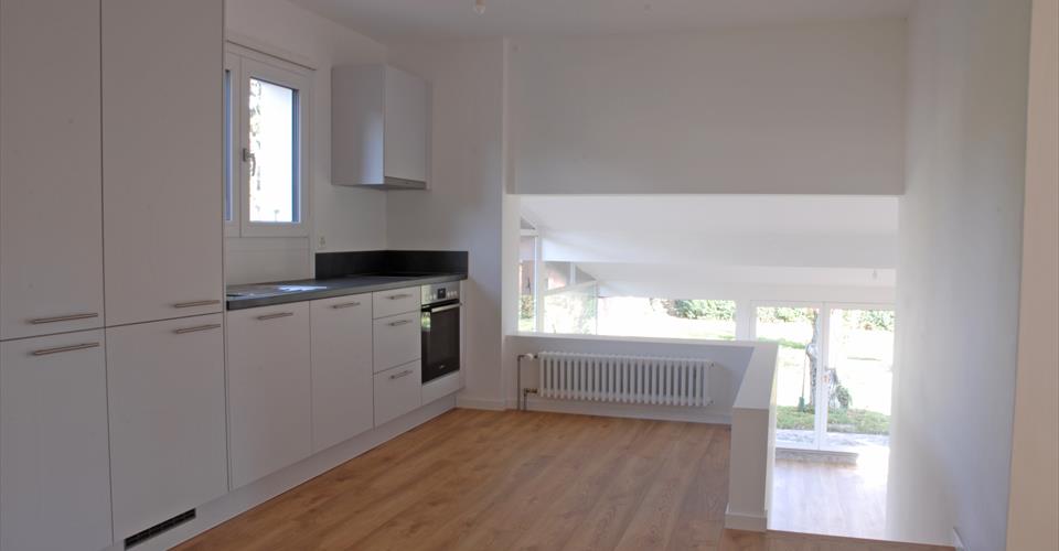 Située dans un quartier résidentiel (dans l’axe des avions), cette villa rénovée en 2023, offre une surface habitable de 130m2 env. + sous-sol. Elle comprend un vaste salon-véranda ouvert sur le jardin, une cuisine ouverte en demi-niveau entièrement équipée, 3 chambres-à-coucher, 1 salle-de-bain. Au rez inférieur, une grande chambre-à-coucher, salle-de-douche, 2 pièces de rangement, buanderie. Grenier dans les combles. Dépendance au fond du jardin. Grand jardin clôturé. 2 places de parc extérieures Disponible dès le 1.11.2025 Loyer mensuel : Sfr. 5’400.-