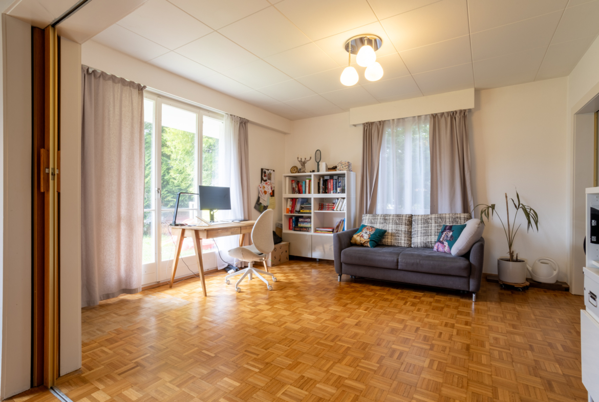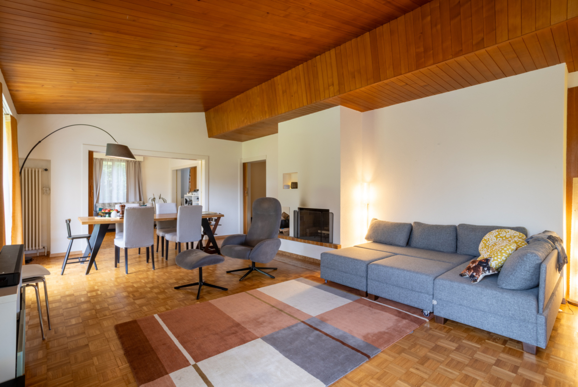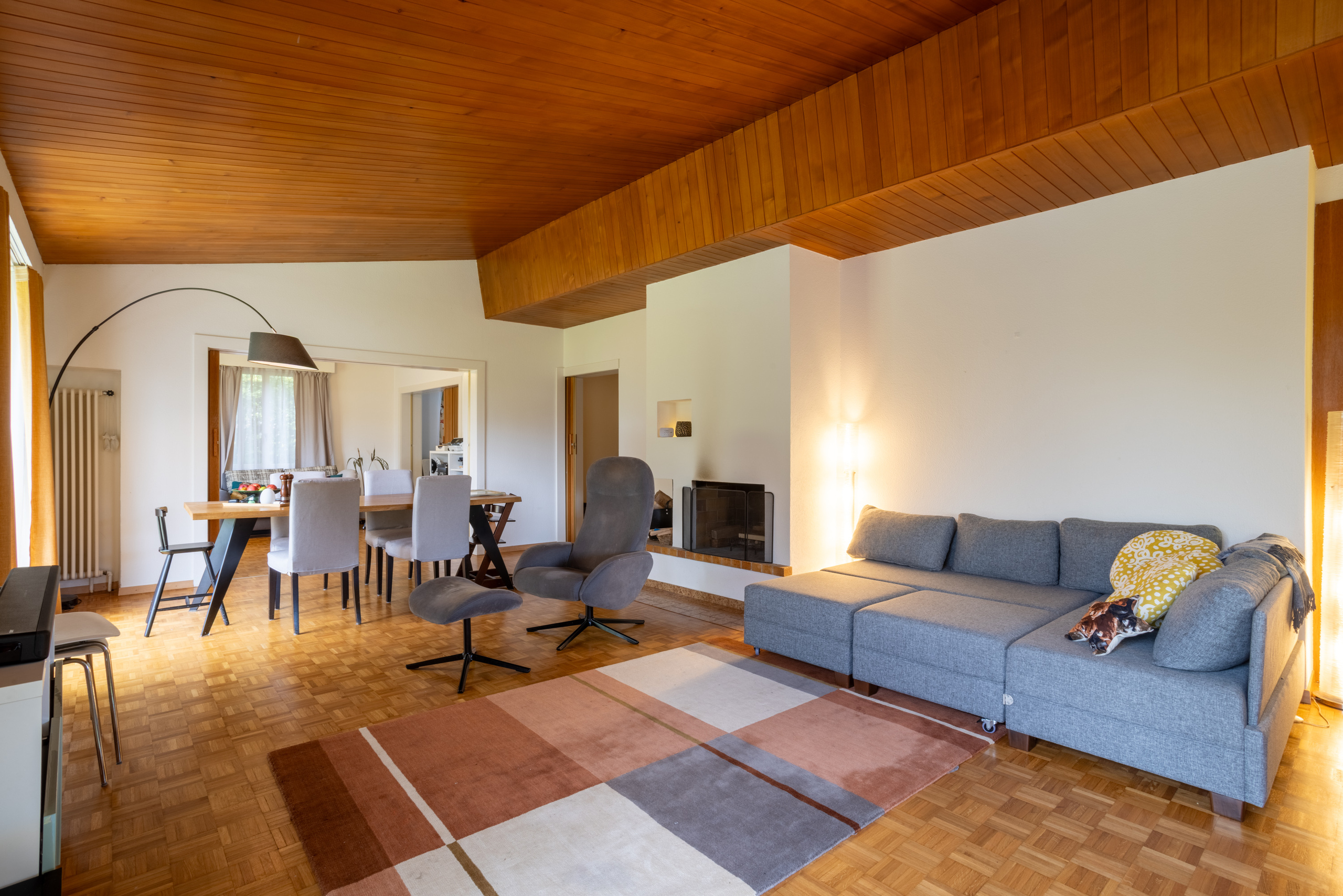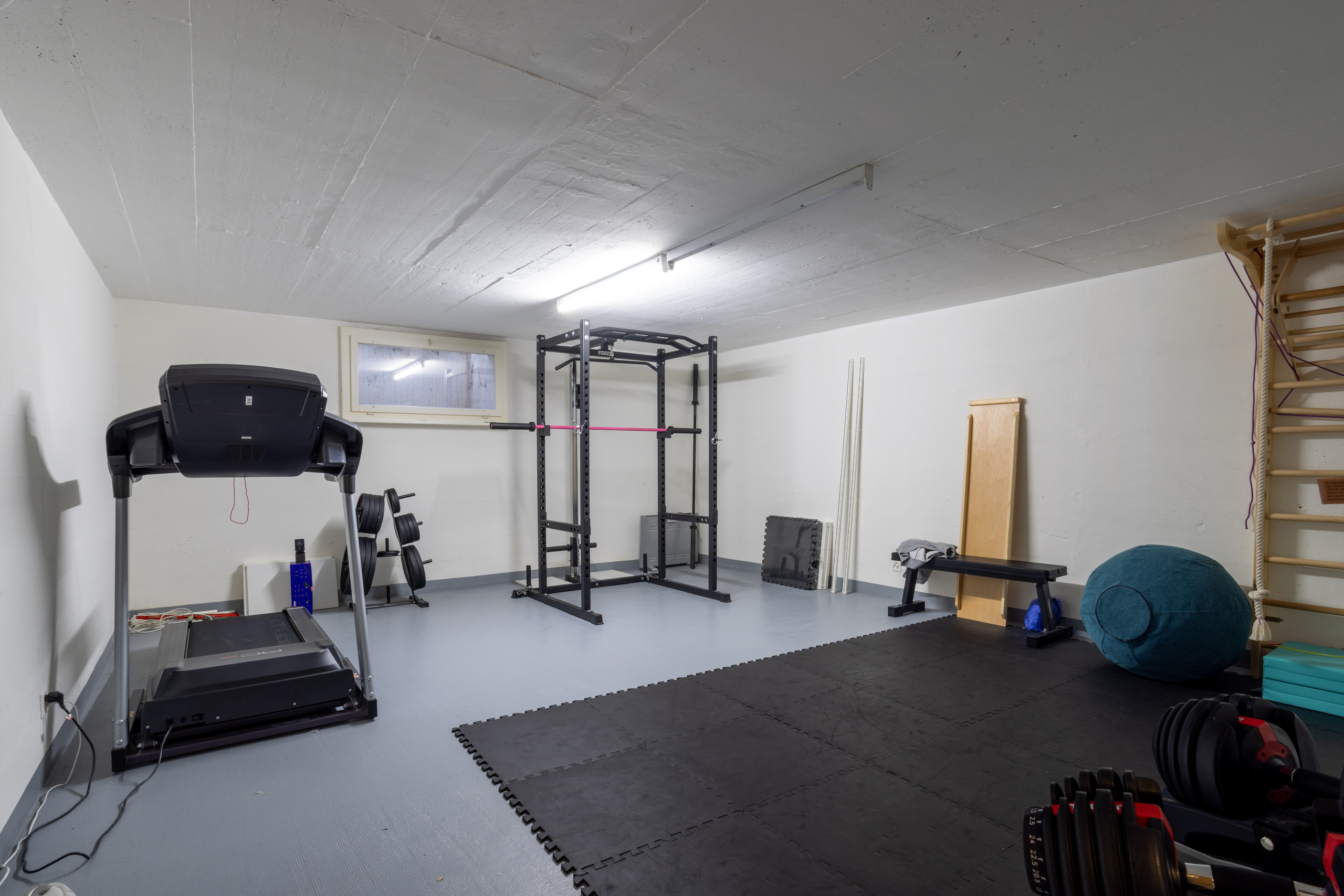 Au sous-sol: grande pièce avec cheminée, WC, grand pièce aménageable (pouvant p.ex. faire office de fitness), cave , abri PC, chaufferie au mazout.