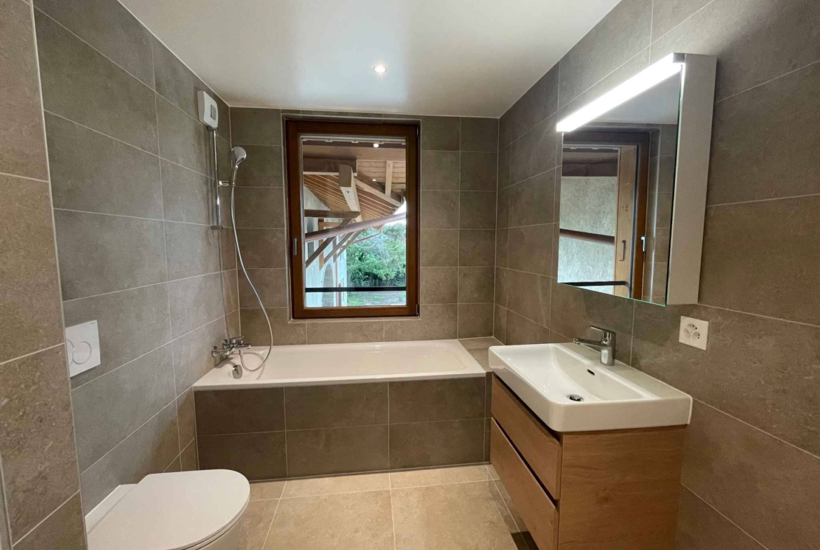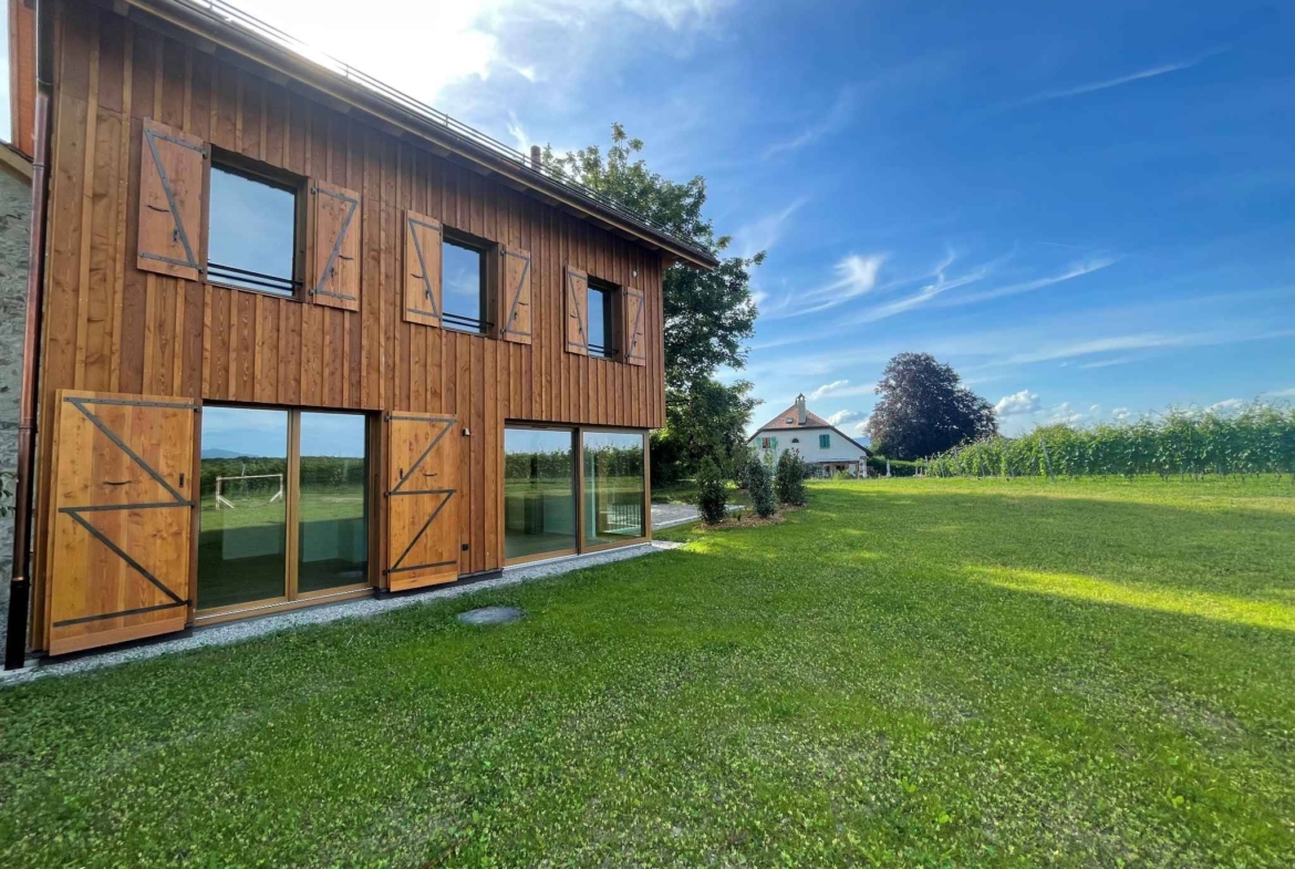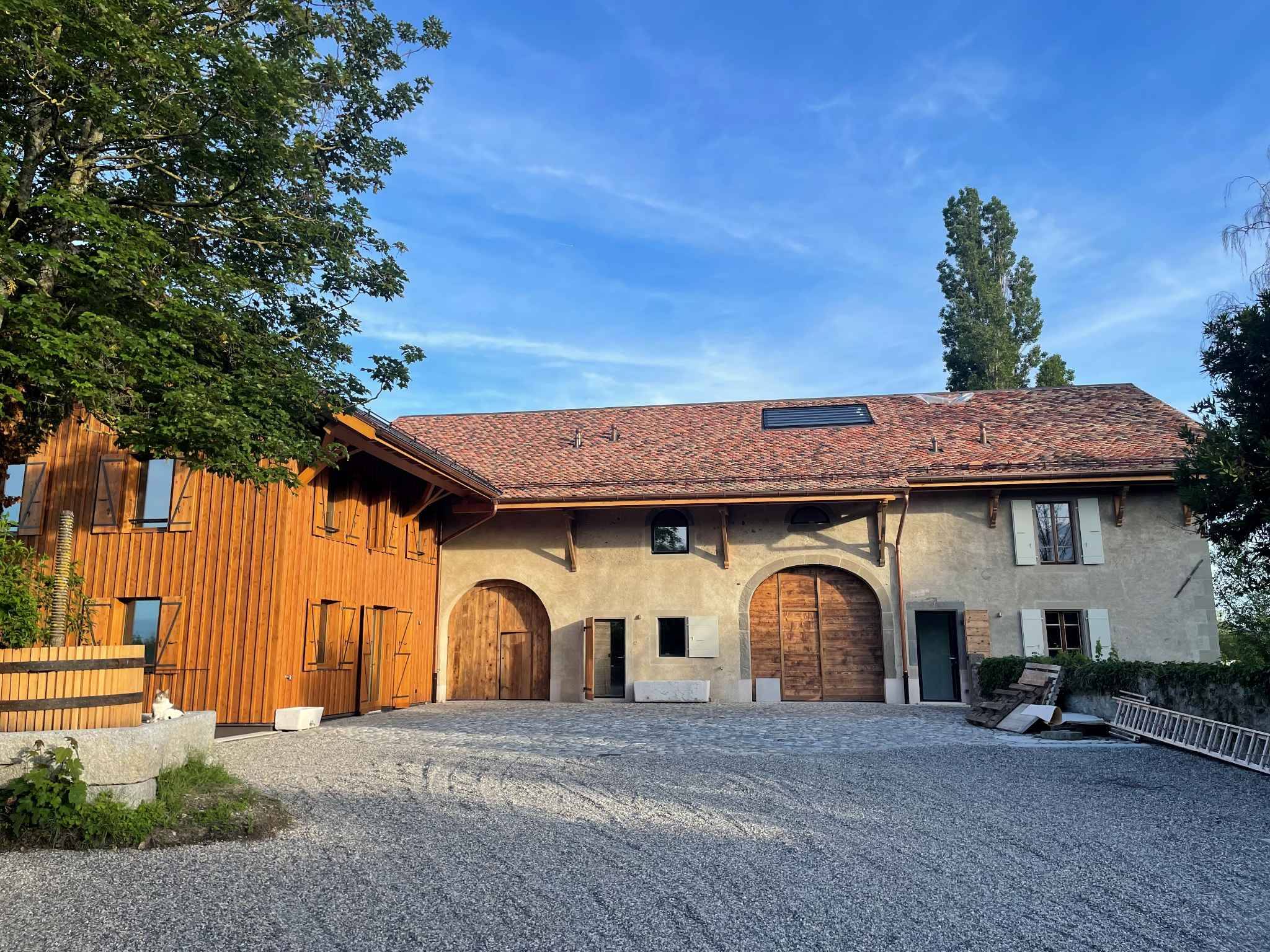 Situé sur la commune de Jussy, au calme de la campagne Genevoise, grand corps de ferme du XIII siècle et sa grange accueillant 4 logements triplex aux prestations de qualité.