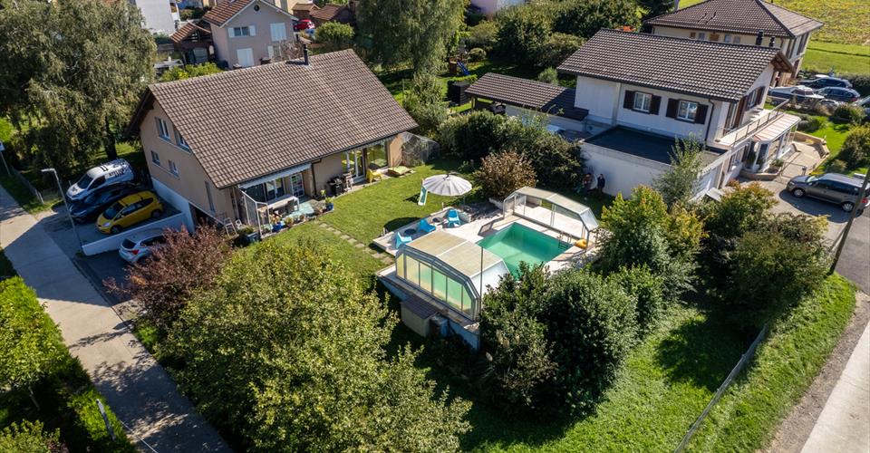 Grande villa individuelle de 7,5 pièces, 202 m² habitables sur une parcelle de 1’160 m², avec une superbe piscine et jardin arboré à l’abri des regards. Dans un quartier très calme, entouré d’arbustes, sans nuisance. À 2 min de l’entrée d’autoroute. CONFORT Quartier très calme, résidentiel Ensoleillement maximal sud, ouest Grand jardin avec piscine avec couverture amovible Terrasse couverte et dallée Pièces : 7,5 Surface habitable : 202 m2 Volume : 1124 m3 Construction : 1977 Chauffage à mazout basse température récemment changé à neuf 2 place de parc extérieures + garage intérieur Disponibilité : à convenir ACCÈS À 1 min de l’autoroute À 7 min d’Yverdon À 20 min de Lausanne À 1h de Bienne ou de Berne Transports publics À 15 min à pied de la gare CFF REZ-DE-CHAUSSÉE Grand hall d’entrée, WC visiteurs et salle de bain, buanderie, chambre, vaste séjour lumineux, cuisine moderne avec îlot central et coin repas, ouvrant sur une terrasse couverte et un superbe jardin arboré avec piscine. 1ER NIVEAU Palier ouvert desservant quatre belles chambres, un réduit de rangement, ainsi qu’une salle de bain avec Velux et WC. SOUS-SOL Sous-sol excavé avec un grand garage, local technique et citerne, cave, abri antiatomique, salle de douche avec WC et buanderie. AMÉNAGEMENTS EXTÉRIEURS Magnifique extérieur avec grande piscine, terrasse couverte, superbe jardin arboré et soigneusement aménagé, parcelle spacieuse conservant l’intimité. Deux places de parc extérieure à l’arrière de la maison. SITUATION Accès immédiat à l’autoroute, sans pour autant avoir de nuisance sonore, vous accédez à Lausanne et Berne très facilement. Idéalement située dans un quartier villas en hauteur de Chavornay, surplombant la plaine de l’Orbe. REMARQUES Que ce soit dans les pièces à vivre ou dans les chambres, cette maison séduit par ses généreux espaces. Idéale pour une grande famille ou pour ceux en quête de confort et de tranquillité, elle offre un cadre parfait en toute intimité. Son grand jardin avec piscine, cette maison a été pensée pour allier confort et détente en famille.