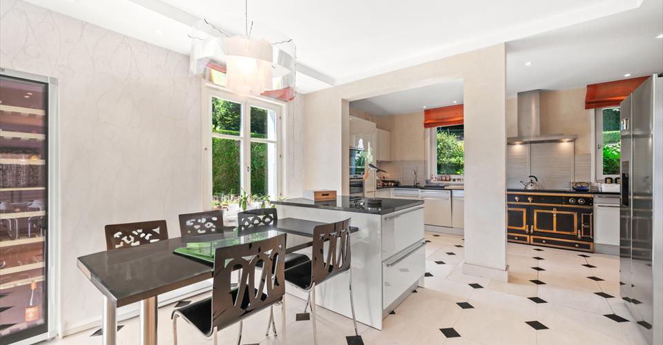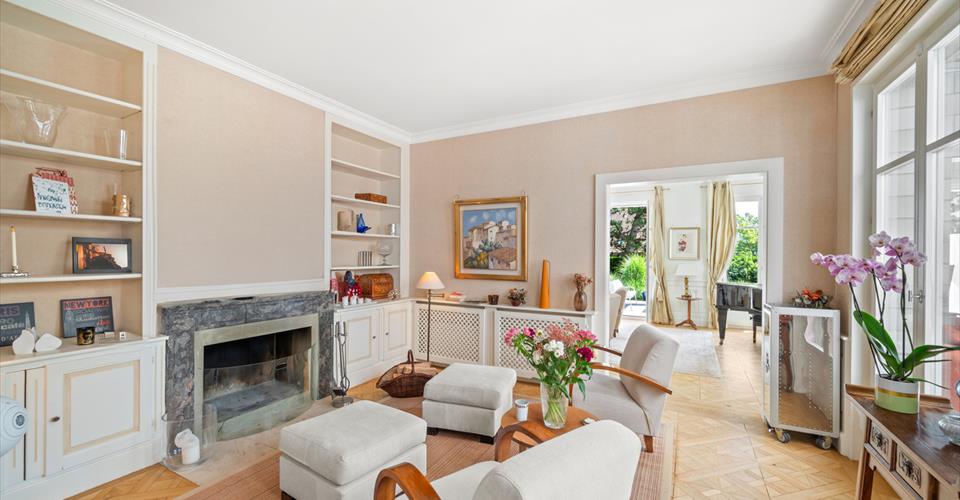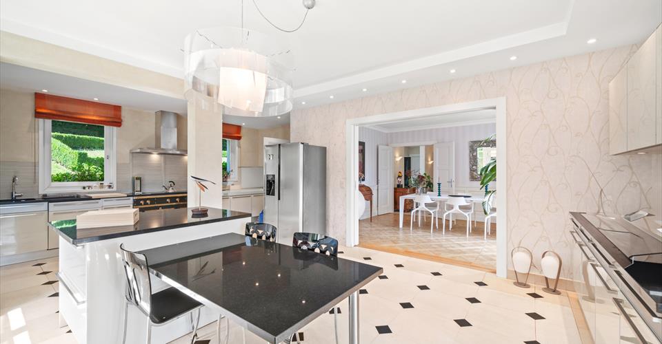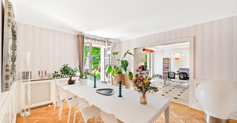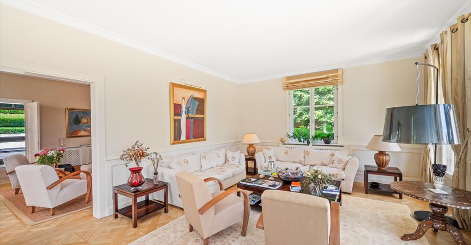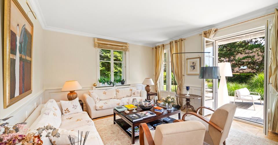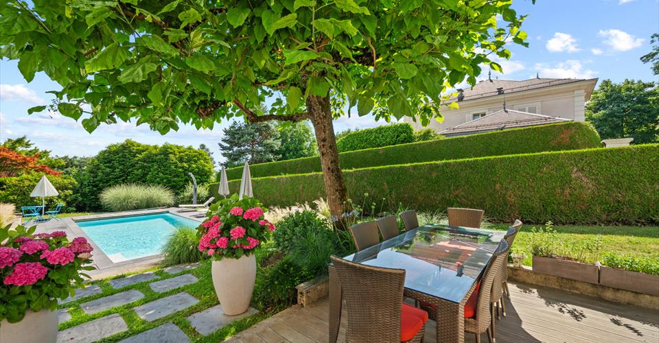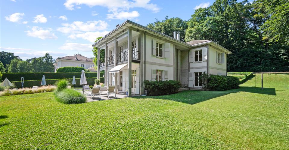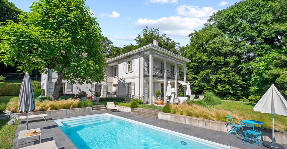 Dès l’entrée, les volumes généreux et les belles hauteurs sous plafond révèlent le caractère noble des lieux. Le choix des matériaux – parquets massifs, marbre, cheminée ancienne – confère à l’ensemble une atmosphère chaleureuse et intemporelle. Les espaces de réception, baignés de lumière grâce aux larges baies vitrées, s’organisent autour d’un double salon avec bibliothèque, d’une salle à manger conviviale et d’une vaste cuisine entièrement équipée. Chacune de ces pièces s’ouvre directement sur les terrasses et le jardin, créant une parfaite continuité entre intérieur et extérieur. Le rez-de-chaussée comprend également des toilettes visiteurs ainsi qu’une chambre avec salle de bain privative et accès indépendant, idéale pour des invités ou un bureau. À l’étage, la suite parentale bénéficie d’un dressing, d’une salle de bain spacieuse et d’un balcon surplombant le parc arboré. Deux autres chambres viennent compléter ce niveau : l’une avec salle de bain attenante, l’autre particulièrement vaste, pouvant aisément être divisée en deux chambres distinctes selon les besoins, ainsi qu’une salle de bain supplémentaire. Le sous-sol, entièrement aménagé, propose des prestations supplémentaires très appréciées : une chambre avec salle de bain, une buanderie, un local technique, une cave à vin et surtout une grande pièce polyvalente de 70 m² pouvant être aménagée en salle de jeux, home cinéma, espace fitness ou salle de réception. À l’extérieur, la propriété dispose de plusieurs places de stationnement, et surtout d’une superbe piscine chauffée entourée de terrasses et de verdure, idéale pour profiter pleinement des beaux jours dans une ambiance calme et exclusive. À proximité des écoles internationales, des commerces de Chailly et des transports publics, cette propriété allie avec élégance confort moderne, intimité et nature. Un bien rare, parfaitement adapté à la vie de famille, où chaque détail a été pensé pour offrir un cadre de vie d’exception.