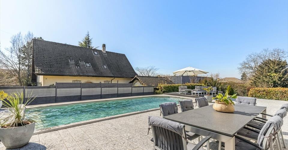Au cœur d’un quartier résidentiel paisible et très recherché, cette superbe villa individuelle de 350 m² utiles séduit par son cadre de vie privilégié, alliant modernité, confort et proximité des commodités tout en étant protégée des nuisances. Entièrement rénovée avec des matériaux de qualité, elle est équipée de panneaux solaires, garantissant une performance énergétique optimale et une installation sans travaux pour les futurs propriétaires. En effet, l’enveloppe de la maison a été entièrement rénovée : toiture refaite avec l’installation de panneaux solaires, isolation périphérique complète et remplacement de toutes les fenêtres, garantissant un confort de vie optimal ainsi qu’une réduction significative des charges énergétiques. Des Espaces de Vie Lumineux et Fonctionnels Dès l’entrée, la villa séduit par ses volumes harmonieux et sa disposition intelligente. Le vaste séjour orienté plein sud s’ouvre sur une terrasse en granit du Simplon et une magnifique piscine chauffée par pompe à chaleur (PAC). La cuisine ouverte, entièrement rénovée, associe design contemporain et fonctionnalité, créant un espace convivial au cœur de la maison. Un atout rare : une suite parentale de plain-pied avec salle de bain privée offre un confort supplémentaire. Un Étage Pensé pour la Famille À l’étage, la maison propose une deuxième suite parentale avec dressing sur-mesure et salle de bain attenante, ainsi que trois chambres lumineuses et une salle de douche moderne. Bien-être et Fonctionnalité au Sous-Sol Le sous-sol abrite un espace bien-être exclusif comprenant une salle de sport, un sauna et une salle de bain dédiée. Il est complété par une cave, une buanderie et un accès direct au garage. Extérieurs Soignés et Convivialité L’extérieur, parfaitement aménagé, offre une vaste terrasse en granit du Simplon, une piscine chauffée par PAC, un cabanon de jardin et un grand parking pouvant accueillir jusqu’à 5 véhicules. Cette villa clé en main combine à la perfection élégance, confort moderne et qualité de vie, le tout à proximité immédiate des écoles, commerces et transports. Une opportunité rare pour les familles en quête d’un cadre de vie privilégié.