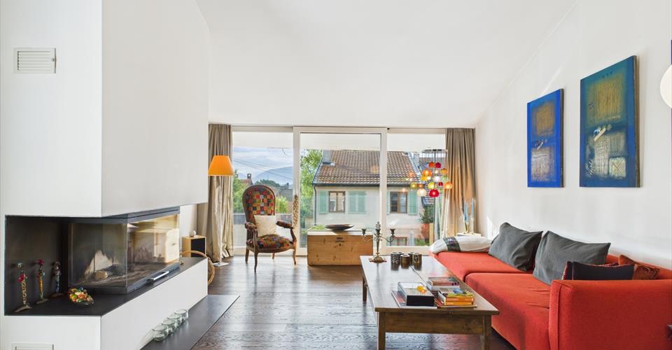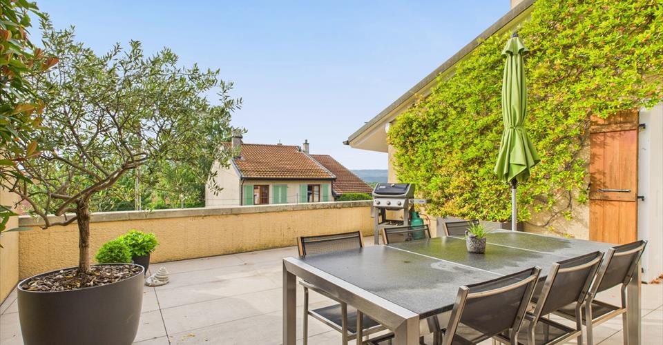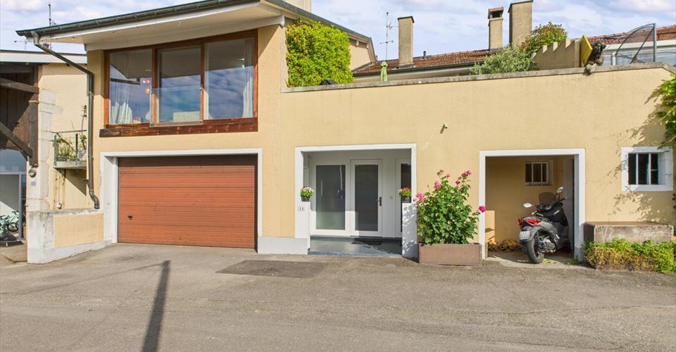 Cette belle villa villageoise profite d’une situation envieuse, en fin d’une rue sans issue. La position légèrement dominante permet à la terrasse d’être protégée de tous les regards. La bâtisse historique, complètement rénovée en 2010 compte seulement deux appartements. Le lot vendu est composé d’un studio (avec entrée séparée, actuellement non loué) et d’un appartement de 5.5p. distribué sur 3 niveaux. Ce dernier bénéficie d’une grande terrasse (sud-est) et d’un garage. L’ambiance intérieure, très qualitative se marie avec les volumes atypiques pour composer une ambiance résolument contemporaine et absolument unique ! L’ensemble est en excellent état et aucun travaux ne sont à prévoir. A visiter sans tarder ! This beautifully renovated townhouse is nestled in a secluded, prime location at the end of a quiet cul-de-sac. From its slightly elevated position, the terrace offers unrivalled privacy — your own hidden haven. Seamlessly modernized in 2010, this exclusive building offers a peaceful and uncommon living experience. The double unit for sale comprises a charming studio with a separate entrance (ready to be rented out or customized to your requirements) and a stunning three-bedroom, three-storey home complete with a sunny, south-east-facing terrace and a large private garage. The home’s high-end finishes blend harmoniously with its unique architectural features, creating a space that feels both contemporary and full of character. This property is move-in ready and impeccably maintained, requiring no additional work. Don’t miss out on this rare opportunity!
