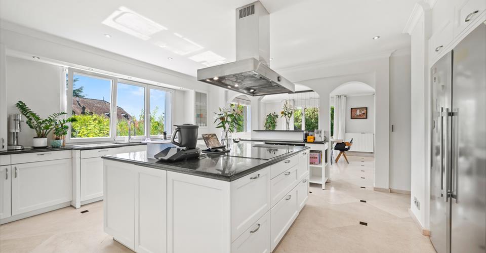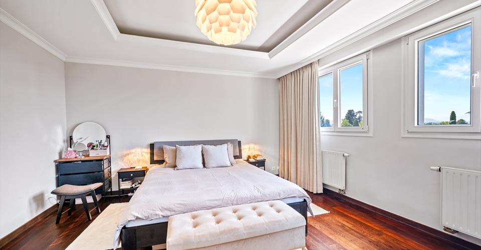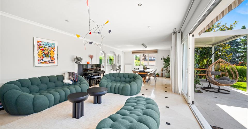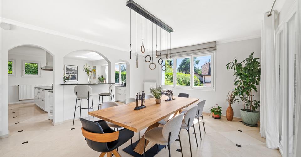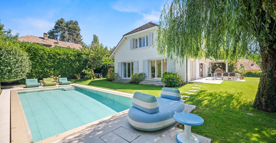 Idéalement située dans un quartier résidentiel calme et verdoyant, à proximité du centre d’Anières et de sa belle campagne, sur la rive gauche de Genève, cette superbe villa individuelle séduit par son charme, son confort, ses volumes généreux et sa belle vue sur le lac. Édifiée en 1960 sur une parcelle de 1’292 m² et régulièrement rénovée, notamment en 2012 et 2022, la propriété offre environ 400 m² utiles. Son aménagement bien conçu et ses prestations de qualité en font une demeure familiale fonctionnelle et très agréable à vivre. Au rez-de-chaussée, le généreux hall d’entrée mène à deux salons séparés par une cheminée double face ainsi qu’à la salle à manger, tous largement ouverts sur la terrasse et le jardin. La grande cuisine, entièrement équipée et vraie pièce à vivre, s’ouvre sur la salle à manger. Elle est complétée par un bar côté salon, offrant une belle convivialité et une vue directe sur la cuisine. Un bureau et des toilettes visiteurs complètent ce niveau. À l’étage, la partie nuit propose deux chambres spacieuses avec salle de bain, ainsi qu’une élégante suite parentale comprenant un généreux dressing et une grande salle de bain et douche. Le sous-sol abrite une chambre indépendante avec salle de douche, idéale pour accueillir du personnel ou des invités, une salle polyvalente (salle de jeux, de télévision), une buanderie, un local technique et une cave à vin de belle taille. À l’extérieur, la terrasse et le jardin joliment arboré invitent à la détente. La piscine chauffée, avec douche extérieure, offre un cadre estival exceptionnel. Le tout bénéficie d’un système d’arrosage automatique et d’un parking pouvant accueillir 4 à 5 véhicules. Cette propriété combine le charme de l’ancien avec le confort moderne, dans un environnement paisible et privilégié.