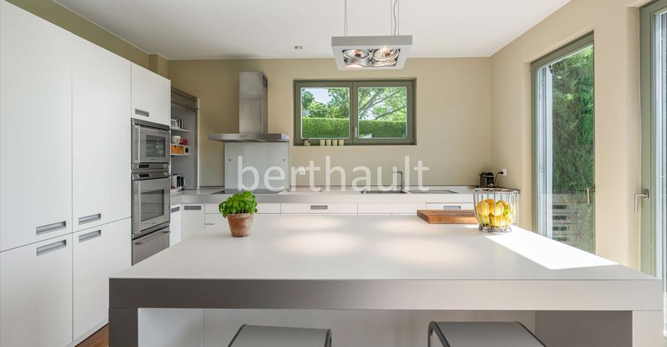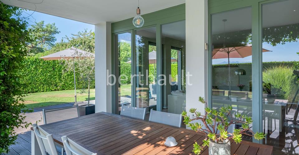 Exclusivité – Construite en 2005 et située dans un quartier très calme cette villa bénéficie d’une vue sur les Alpes et le Mont-Blanc. Baignée de lumière grâce à son exposition optimale et à ses nombreuses ouvertures le rez-de-chaussée dispose d’une cuisine ouverte Bulthaup, d’une salle à manger, d’un généreux salon avec une belle cheminée, d’un bureau, d’un joli hall d’entrée et d’un WC visiteurs. Un large escalier contemporain mène au premier étage qui offre une chambre de maître avec dressing et salle de bains attenante ainsi que deux chambres supplémentaires dont une avec balcon, une salle de bains séparée et une bibliothèque pouvant être aménagée en 4ème chambre. Le sous-sol bénéficie d’un salon TV de 30 m², d’une chambre d’amis, d’une salle de bains, d’une buanderie, d’une cave à vin et de la chaufferie. Les extérieurs offrent un jardin paysager, une loggia d’été, un garage fermé pour deux voitures et deux places de parking. Alarme, arrosage automatique et robot pour le gazon.