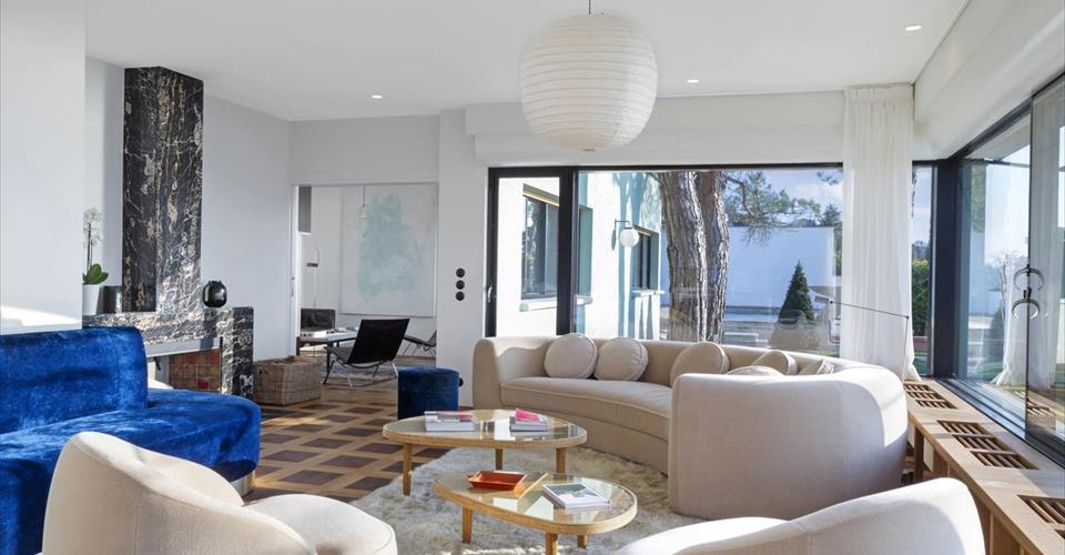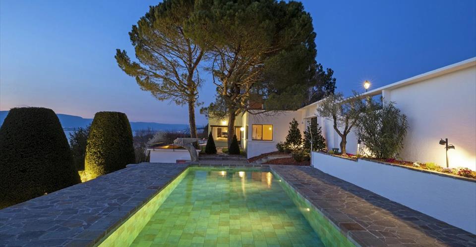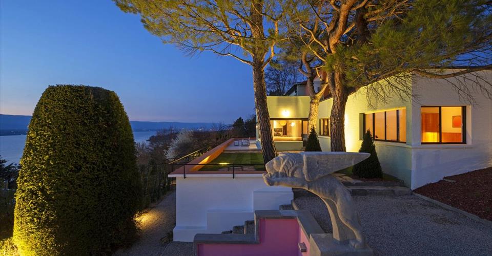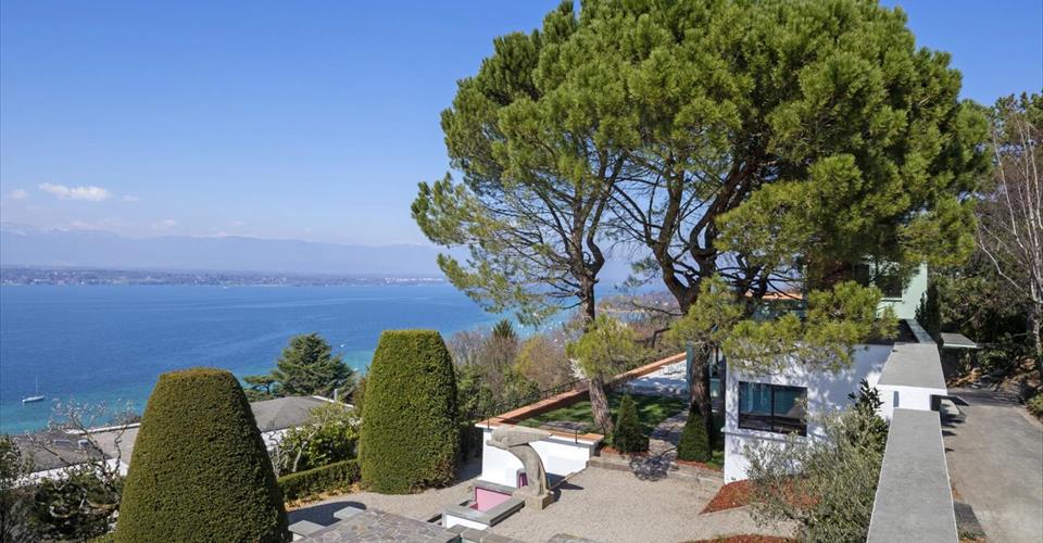 Située sur les hauteurs prisées de Cologny, la villa Les Ailes est une propriété rare, construite en 1932 par les architectes Jean-Jacques Honegger et Louis Vincent dans un style moderniste inspiré de Le Corbusier. Elle offre un cadre de vie unique, mêlant architecture remarquable et vues spectaculaires sur le lac Léman et le Jura. Un cadre de vie privilégié et une architecture pensée pour le confort et la lumière La maison se compose de plusieurs volumes imbriqués, parfaitement intégrés à la topographie du terrain. Le rez-de-chaussée accueille un vaste séjour lumineux ? appelé « studio » ? qui s’ouvre largement sur le jardin et la terrasse grâce à de grandes baies vitrées. Ce séjour, à la fois espace de vie et de réception, est doté d’une cheminée intégrée dans une paroi sculptée. Des espaces intimes et fonctionnels L’aile sud de la villa est dédiée à la suite parentale, elle comprend une bibliothèque, un dressing spacieux, une chambre principale et une salle de bain baignée de lumière naturelle grâce à une baie vitrée en verre cathédrale. À l’étage, une chambre d’amis avec salle de bain privative donne accès à une grande terrasse-solarium sur le toit ? un véritable espace de détente en hauteur. Le rez inférieur, accessible depuis l’intérieur, offre plusieurs places de parc extérieures ainsi que deux à l’intérieur, une buanderie, une chaufferie, une cave, ainsi qu’un petit logement indépendant, idéal pour du personnel ou des invités. Cette villa est idéale pour un amateur d’architecture recherchant un bien d’exception dans un environnement calme, verdoyant et prestigieux, à quelques minutes du centre de Genève. La propriété, construite sur une parcelle de 2’197m2, offre une surface totale de 400m dont 302m2 habitable. Entretiens inclus dans le loyer (jardin, piscine, etc..) + charges individuelles