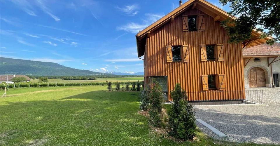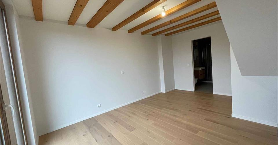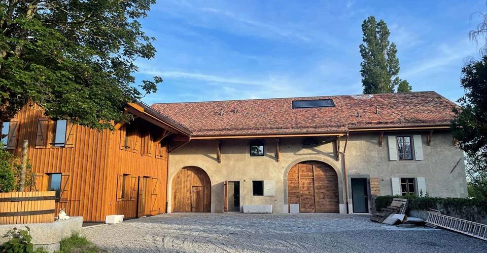Coup de coeur ! Situé sur la commune de Jussy, au calme de la campagne Genevoise, grand corps de ferme du XIII siècle et sa grange accueillant 4 logements triplex aux prestations de qualité. La bâtisse est classée et inscrite à l’inventaire des immeubles dignes d’être protégés. Ainsi, l’architecte et la CMNS ont apporté un soin particulier à la conservation des murs et poutres historiques constituant la ferme. Descriptif du logement “La Grange” (12D) situé en pignon d’environ 134m² : Rez-de-chaussée : Hall d’entrée avec armoires, cuisine ouverte entièrement équipée sur un séjour avec poêle à bois et son accès jardin, une chambre avec accès jardin et sa salle de douche attenante avec toilettes et espace buanderie (appareils non fournis). 1er étage : 3 chambres dont 2 avec armoire, une salle de douche avec toilettes, une salle de bains avec toilettes attenante à l’une des chambres. Combles : Magnifique suite parentale d’environ 15m² avec salle de bains ouverte et toilettes séparés. Agréable vue sur les vignes et la campagne environnante. Depuis l’extérieur, vous accédez à une cave située au sous-sol de l’immeuble d’environ 9m². Grand jardin privatif (non clôturé) d’environ 600m² dont l’entretien est à la charge du locataire. 2 places de parking extérieur : Frs. 100.– / place / mois Acompte mensuel de charges (chauffage / eau chaude/Frais accessoires) : Frs. 300.– L’immeuble est équipé d’une pompe à chaleur et de panneaux solaires répondant aux normes HPE (Haute Performance Energétique). Chauffage au sol, triple vitrage, parquet en chêne. Transports en commun TPG (Arrêt à 100m environ) via les lignes 32, 37 et 39. Navette disponible pour l’école Moser depuis Jussy Renseignement & Visites : Viensavanh OUDOMRACK