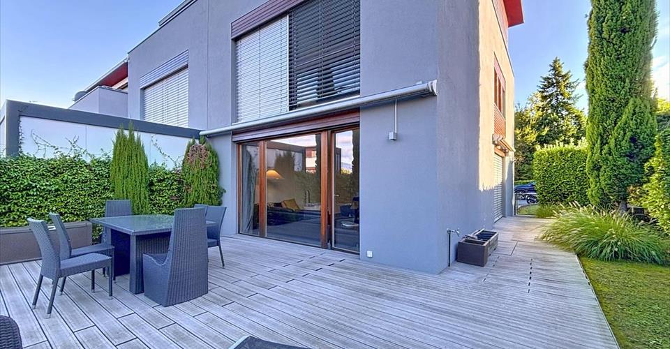 Magnifique villa jumelle moderne MEUBLEE située en zone de Cointrin de la commune de Vernier, secteur calme et vert proche de l’Avenue Louis-Casaï. Proche des grands axes, de l’aéroport, des commerces et des écoles, cette villa se développe sur trois niveaux hors sol et bénéficie d’un jardin orienté nord-est et sud-ouest. La typologie d’habitation présente 7 pièces pour une surface habitable d’environ 192m² : REZ DE CHAUSSÉE : – Entrée avec armoires – Cuisine équipée ouverte sur la salle à manger – Grand séjour, accès terrasse en bois 1er ÉTAGE : – 3 chambres à coucher avec armoires – Salle de bains avec jacuzzi 2ème ÉTAGE – Master bedroom avec armoires et terrasse privative – Salle de douche en suite – Espace bureau avec terrasse SOUS-SOL – Chaufferie – Buanderie équipée – Cave – Salle de cinéma – WC visiteurs Une place de parking couverte complète ce bien avec possibilité de louer une place de parking extérieure supplémentaire. CONDITIONS LOCATIVES : – Loyer mensuel : CHF 6’600.- – Charges CHF 200.- – TOTAL MENSUEL : CHF 6’800.- + charges individuelles (électricité, eau, chauffage, entretien jardin etc) – Loyer mensuel place de parking extérieure supplémentaire : CHF 150.-