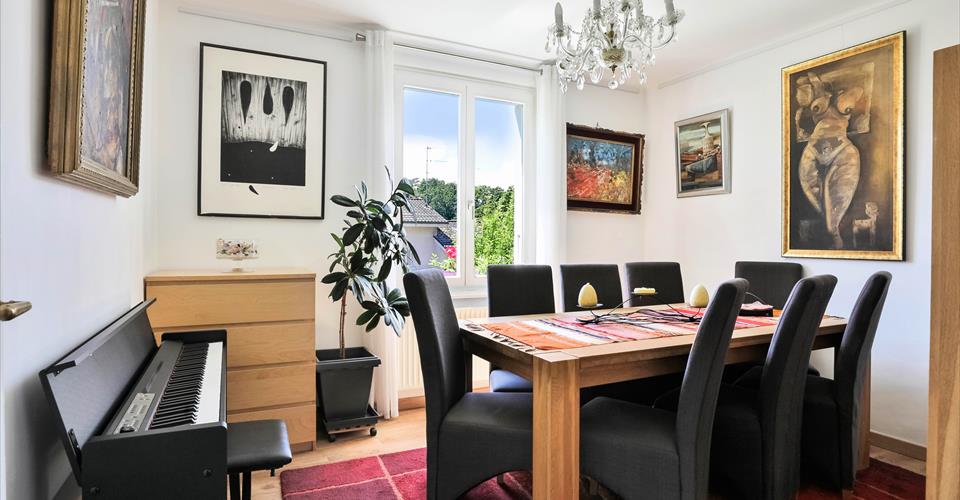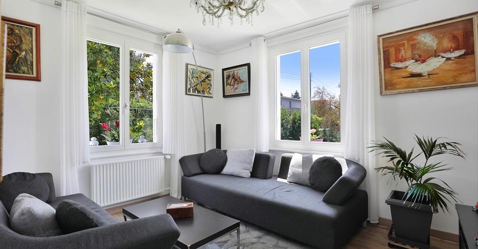 Dans une ruelle calme de Chambésy, cette villa des années 40 rénovée offre une surface habitable d’env. 135 m2 + cave. Elle est composée au rez supérieur d’un salon, d’une salle-à-manger, d’une cuisine fermée entièrement équipée, une salle-de-douche wc. A l’étage, 3 chambres-à-coucher, 1 salle-de-bain. Grenier dans les combles. Le rez inférieur comprend une chambre, 1 salle-de-douche et une cave. Joli jardin clôturé agrémentée d’une tente. Box pour une voiture. Disponibilité au 1er décembre 2025 Loyer mensuel : Frs 5’400.-