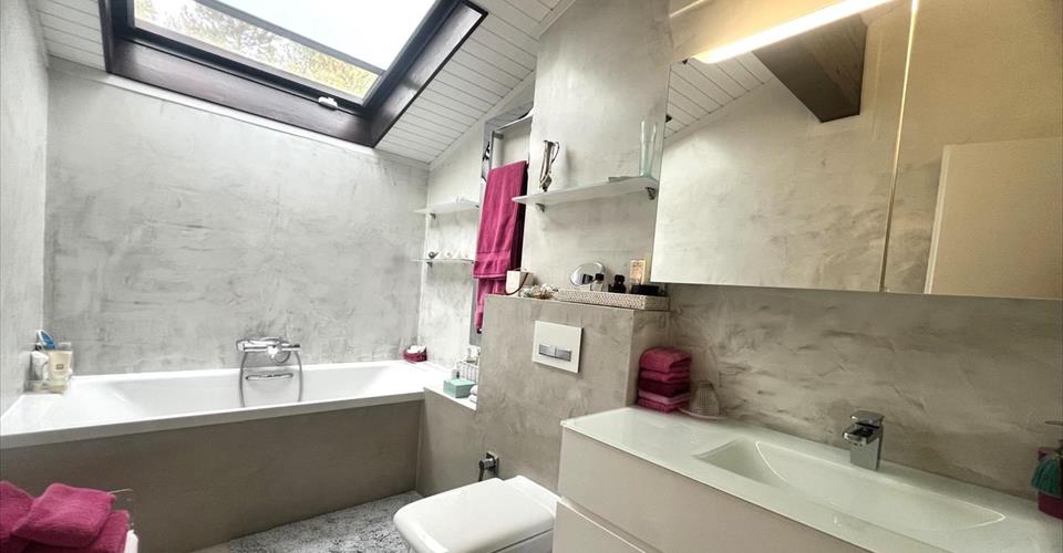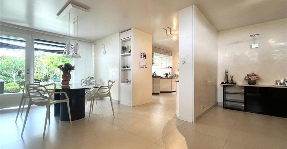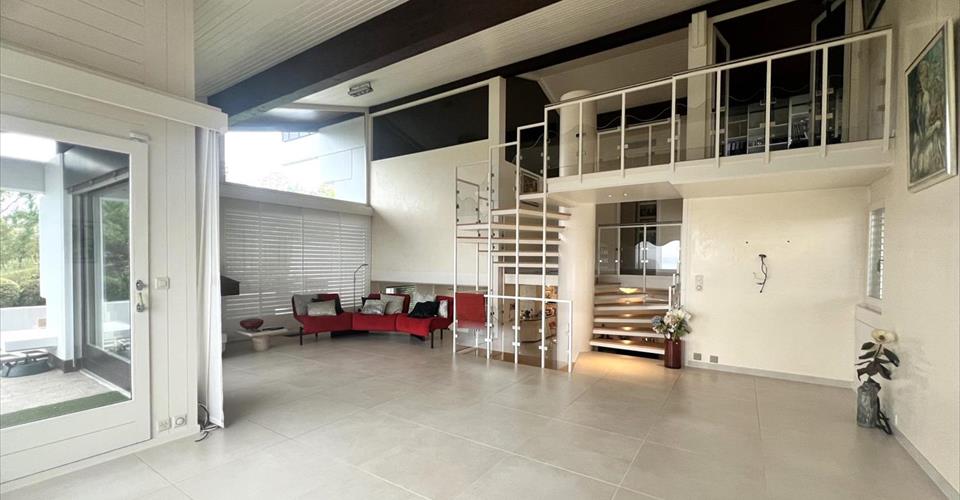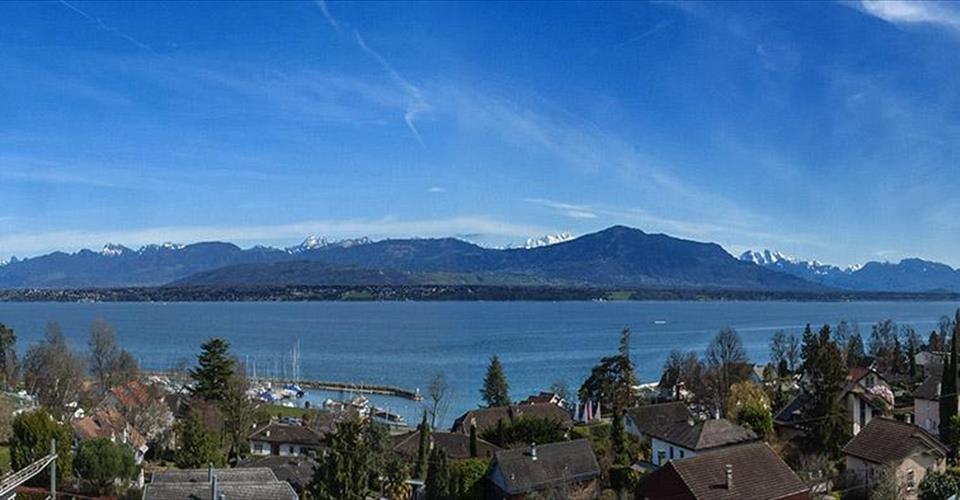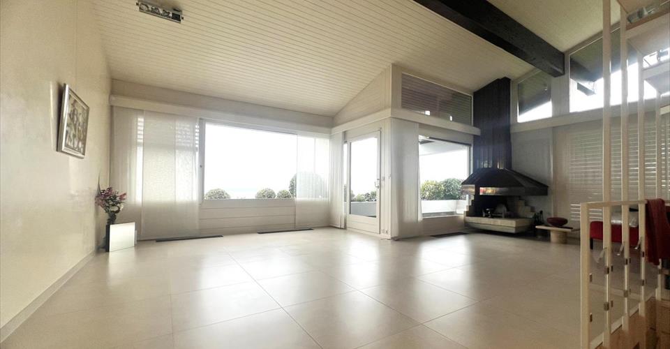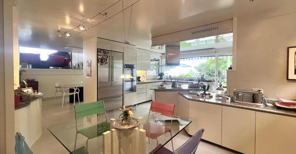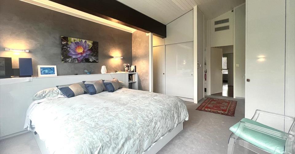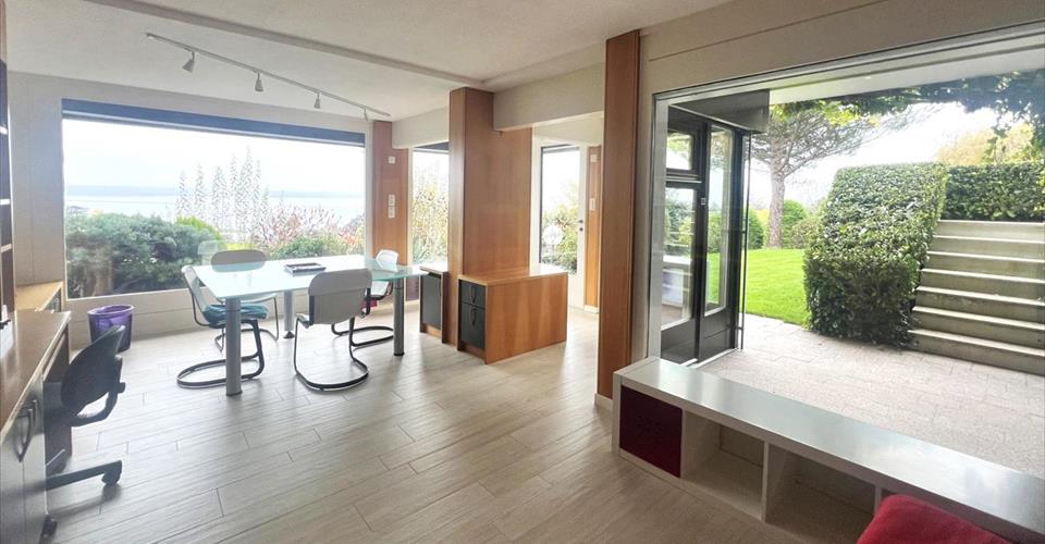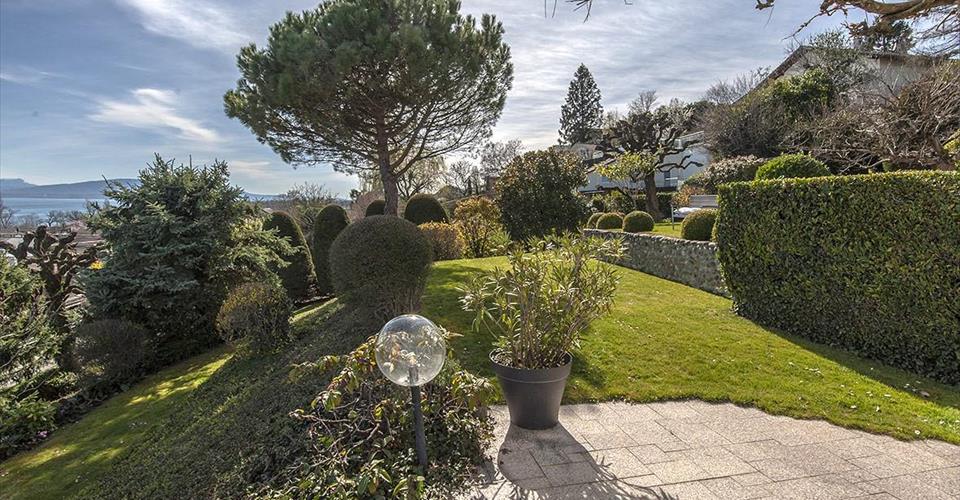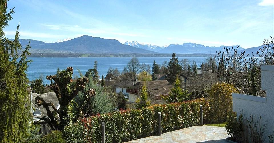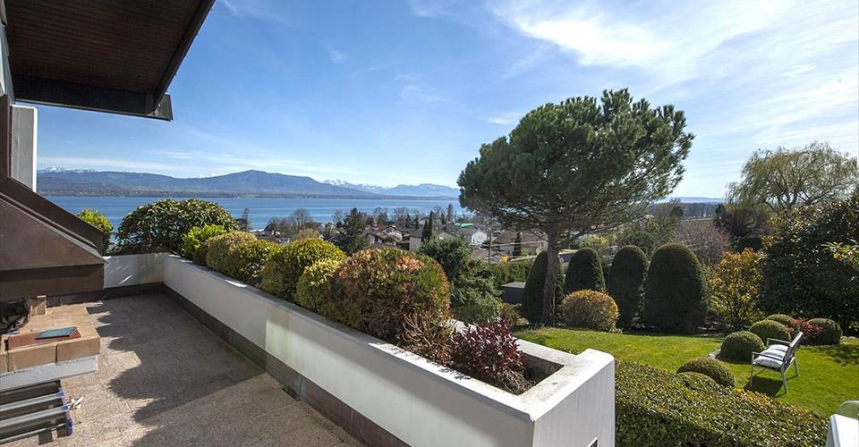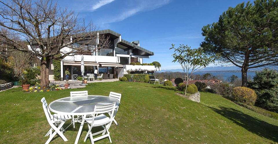 Cette villa individuelle d’architecte se compose de grands espaces répartis sur plusieurs demi-niveaux, avec une belle hauteur sous plafonds. La luminosité est optimale grâce aux nombreuses baies vitrées et les matériaux y sont de grande qualité. Son orientation permet de profiter de la vue splendide sur le lac, les Alpes et le Mont-Blanc, depuis la plupart des pièces. La parcelle est aménagée avec beaucoup de goût et magnifiquement entretenue. Possibilité de location non meublée. Distribution : Premier niveau : Buanderie Salle de douche Deux grandes chambres à coucher dont une avec accès à une terrasse et au jardin Deuxième niveau : Vaste hall d’entrée Chambre à coucher, accès jardin Salle de douche Salle à manger, accès à une terrasse et au jardin Grande cuisine habitable, accès à la terrasse et au jardin Troisième niveau : Très grand séjour climatisé avec cheminée, accès à une terrasse avec barbecue et au jardin Quatrième niveau : Hall Chambre à coucher climatisée avec salle de bains et dressing attenants, accès à un balcon Chambre à coucher climatisée Chambre à coucher avec accès au balcon Salle de douche Cinquième niveau : Grand bureau Sous-sol : Deux disponibles Abri PC Grand garage Places de parc extérieures Arrosage automatique dans le jardin Chauffage électrique par radiateurs (panneaux solaires pour la production d’eau chaude)