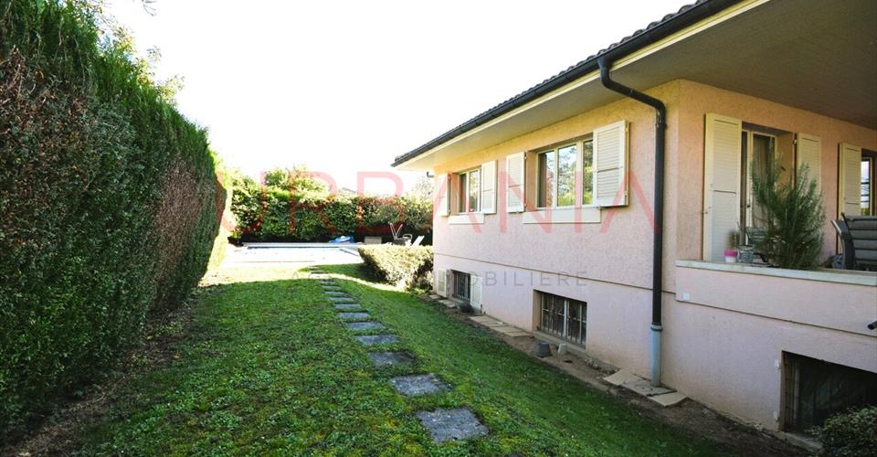 Idéalement située à Vésenaz, cette spacieuse maison individuelle bénéficie de la proximité de la campagne et des commodités du village. Edifiée sur une parcelle de plus de 1’000m2, elle jouit d’une piscine et d’un jardin, sans vis-à-vis, propice à la détente. La maison offre une surface utile de 539m2, distribuée sur trois niveaux. Le rez-de-chaussée se compose d’un hall d’entrée avec wc visiteurs, d’un grand séjour, avec un espace salle à manger et un espace salon. Les deux ont un accès direct à la terrasse d’environ 60m2. Une cuisine habitable vient compléter le côté jour. L’espace nuit comprend un dégagement desservant trois chambres, dont l’une bénéficie d’une salle de bains privative avec lavabo, baignoire et toilettes. Une salle de bains indépendante est également à disposition. Les combles consistent en un vaste espace de rangement, éclairé par des velux, à réaménager au gré de l’acheteur. Au sous-sol, vous trouverez une chambre supplémentaire avec salle de bains, une deuxième salle d’eau avec toilettes, une grande pièce servant de studio avec cuisine équipée, une salle de gym avec sauna, une cave, une buanderie, ainsi que divers espaces techniques et de rangement. Ce niveau inclut également un grand garage pouvant accueillir jusqu’à quatre véhicules. A l’extérieur, trois autres places de stationnement viennent compléter ce bien. Il est à noter qu’une réserve de droit à bâtir de 125m2 environ est disponible.