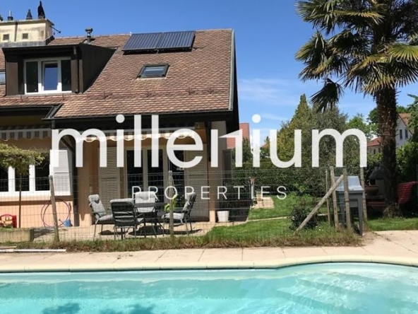 Située entre les prestigieux quartiers Cologny et Vandoeuvres, à deux pas du Golf Club de Genève, cette superbe villa individuelle allie charme classique et confort moderne. Nichée sur une parcelle piscinable de 1’100 m² soigneusement entretenue, la propriété se distingue par son architecture élégante et ses finitions haut de gamme, résultat d’une rénovation complète en 2016. Avec une surface utile d’environ 470 m², elle offre de généreux espaces de vie et s’organise comme suit : Rez-de-chaussée : Un hall d’entrée, un salon avec cheminée, une véranda lumineuse de 15 m², une vaste salle à manger, une cuisine contemporaine avec coin repas, un vestiaire et des WC visiteurs. Étage : Une suite parentale avec dressing et salle de bains attenante, un spacieux dressing supplémentaire (pouvant être transformé en chambre), deux chambres à coucher (dont une avec salle de bains privative), une salle de douche et un WC séparé. Sous-sol : Une grande salle polyvalente, une chambre avec salle de bains attenante, une buanderie, et un abri. Extérieurs : La propriété bénéficie d’un cadre verdoyant et paisible, agrémenté de plusieurs terrasses, dont une offrant une vue partielle sur le lac. Un annexe avec une chambre et salle de bains privative, un garage, un abri utilitaire et des places de parking extérieures viennent compléter ce bien rare. Avec son emplacement exceptionnel et son charme intemporel, cette villa constitue une opportunité unique dans l’un des quartiers les plus prisés de Genève.