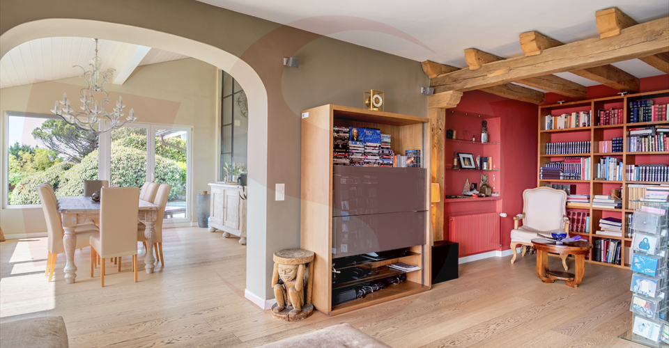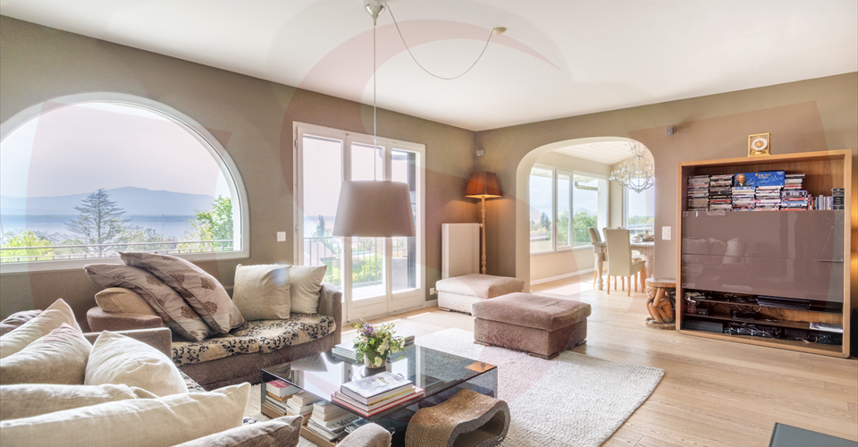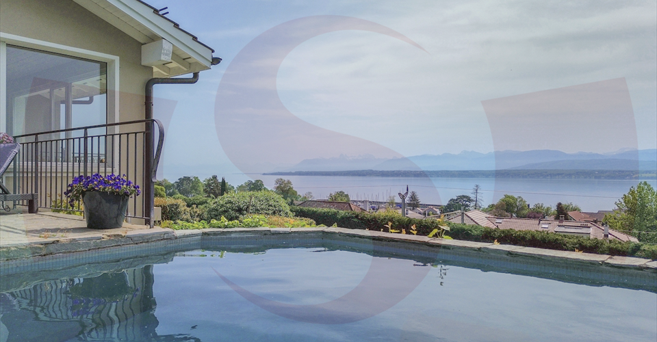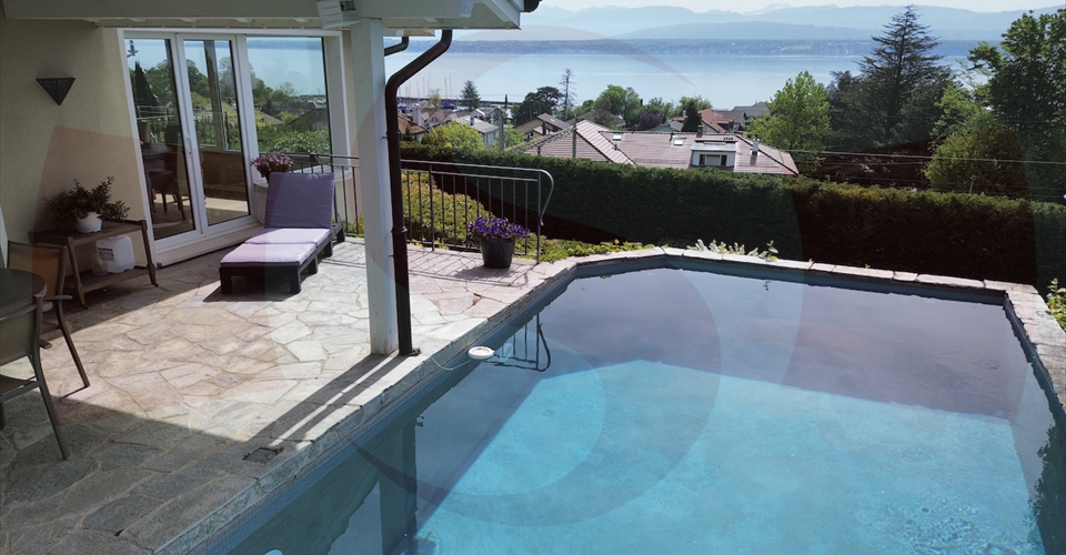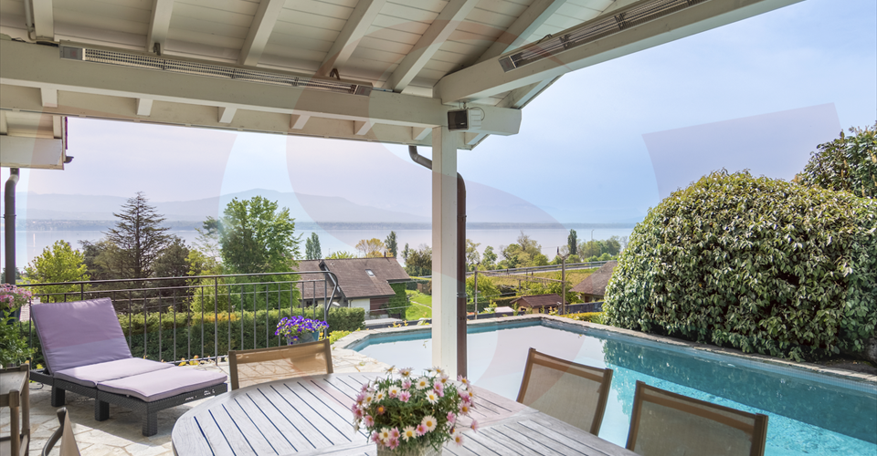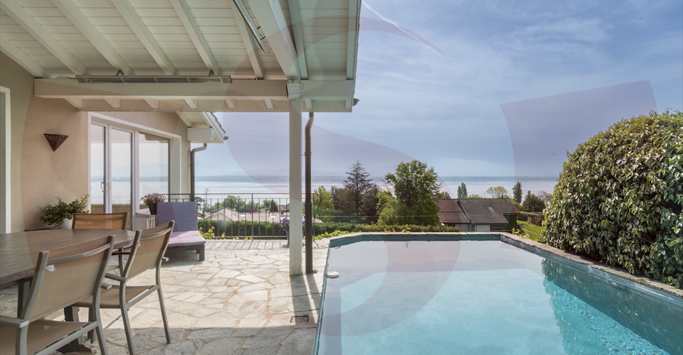 Construite en 1970 sur une parcelle 1.420 m², cette maison a été agrandie et rénovée en 2007. Elle domine le lac et offre à ses occupants une vue panoramique sur le Léman et les montagnes. L’entrée principale se trouve au rez-inférieur où l’on trouve un appartement indépendant composé d’une chambre avec son dressing et sa salle de bain et d’un salon plus cuisine. Se trouve également à ce niveau une chambre d’amis avec sa salle de bain attenante, un bureau indépendant, un atelier, une buanderie et un local technique. Au rez-supérieur il y a un WC visiteurs avec une penderie, la chambre principale avec son dressing et sa salle de bain ainsi qu’une autre chambre. La partie jour est composée d’un salon avec cheminée et un coin bibliothèque, d’une salle à manger et d’une très belle cuisine familiale donnant sur la terrasse couverte et la piscine. Toutes ces pièces offrent une magnifique vue sur le lac. La maison pourrait être agrandie d’environ 100 m², par l’ajout d’un étage supplémentaire par exemple. Un parking extérieur pour quatre voitures complète la propriété.