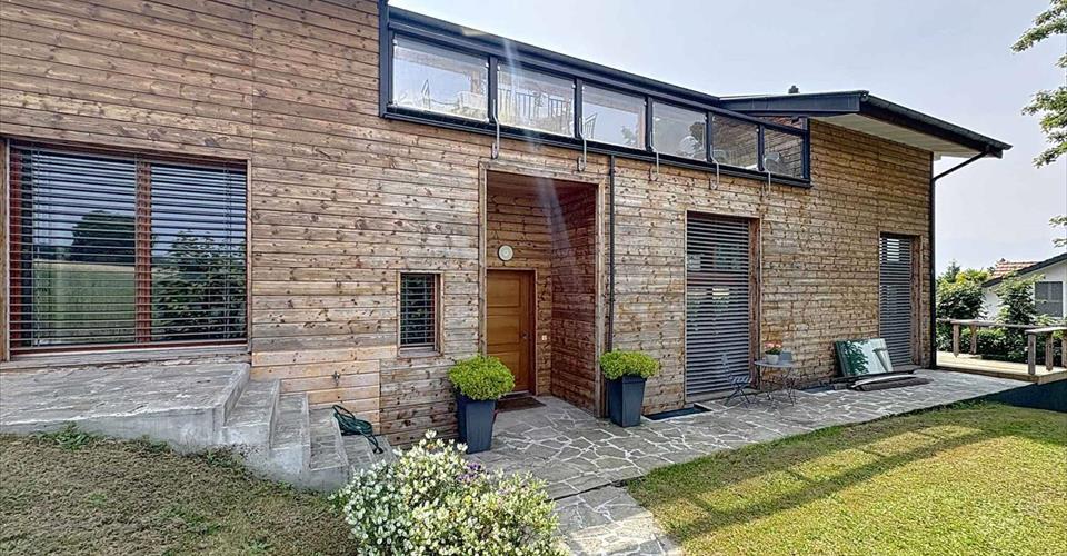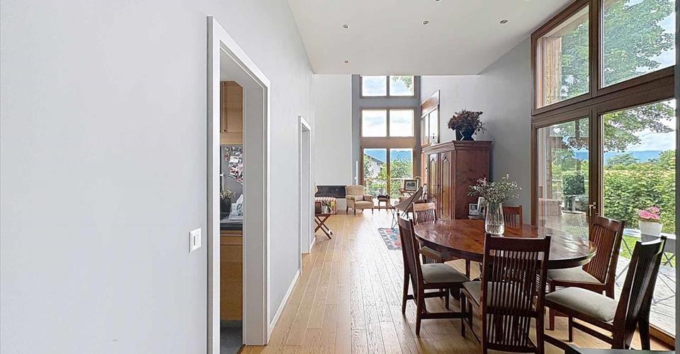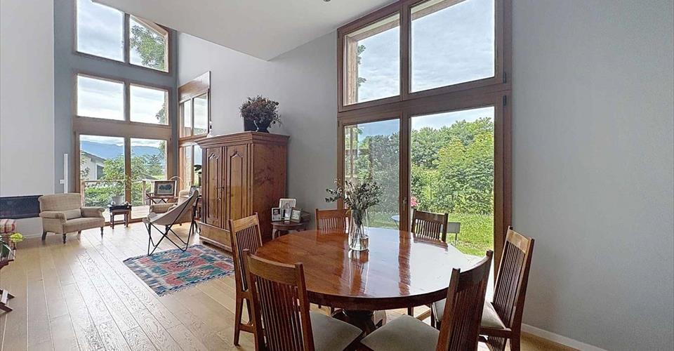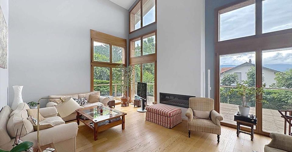 Cette belle maison individuelle contemporaine se situe dans un quartier de villas, dans un petit chemin, en retrait des grands axes et face à de grands champs agricoles, ce qui lui assure un environnement préservé. Erigée en 2007, sur une belle parcelle de plus de 900 m², elle séduit par son architecture moderne, ses vastes espaces et ses belles hauteurs sous plafond. Labellisée Minergie, et coordonnant harmonieusement différents matériaux, elle offre un confort optimal et une belle luminosité. D’une surface habitable d’environ 206 m² et 320 m² utiles, ses espaces sont ainsi distribués : Rez-de-chaussée : Partie jour : Hall d’entrée avec WC visiteurs Grande cuisine fermée, équipée, agencée Spacieux séjour / salle à manger avec cheminée et belle hauteur sous plafond Partie nuit : Une chambre à coucher avec sa salle de douche attenante, douche italienne Deux chambres à coucher avec armoires encastrées Une salle de bains complète Une chambre parentale avec dressing et salle de bains complète (baignoire/douche/double vasque/WC), belle hauteur sous plafond 1er étage : Espace aménagé en bureau/salon TV avec vide sur le séjour et accès à la terrasse, vue champs et lac, orientée Nord/Est Espace combles d’environ 60 m2, à aménager. Sous-sol : Réduit sous l’escalier Pièce polyvalente avec branchement technique internet / outils Salle de douche complète Pièce de rangement avec saut-de-loup Pièce polyvalente / salle de jeux / salon TV chauffée Chambre à coucher / bureau Pièce polyvalente, sans fenêtre, pouvant devenir un home-cinéma Local technique / buanderie Grande pièce / économat Cave Un couvert pour 2 véhicules et plusieurs places de parc extérieures complètent agréablement la villa.