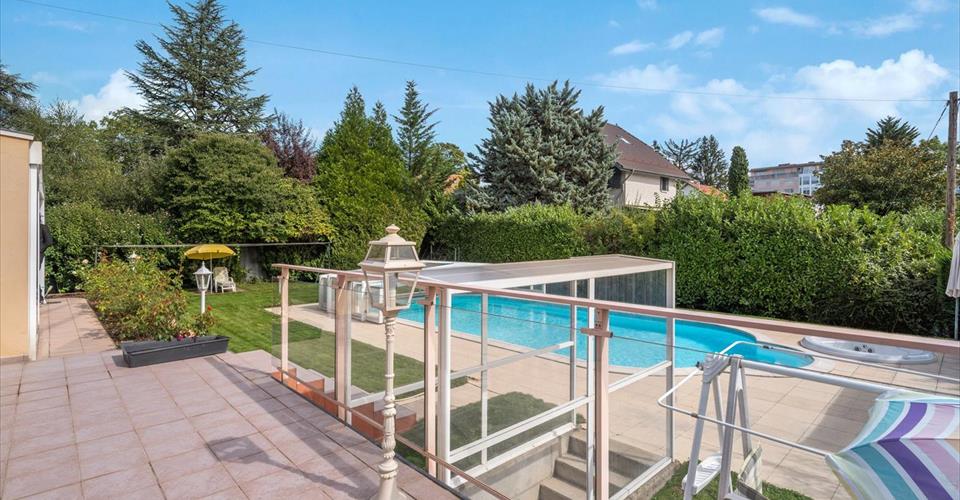 À seulement quelques minutes de l’aéroport, cette propriété allie l’élégance d’un cadre de vie spacieux et lumineux. Le vaste jardin privé est agrémenté d’une magnifique piscine, idéale pour se détendre en toute intimité ou recevoir des invités lors des chaudes journées d’été. De généreuses terrasses, aménagées avec goût, vous invitent à savourer des moments de convivialité en plein air, tout en profitant d’une vue dégagée et d’une atmosphère apaisante. L’intérieur de la maison, lumineux et spacieux, propose un salon baigné de lumière naturelle grâce à ses larges baies vitrées, s’ouvrant directement sur la terrasse et le jardin. Les chambres à l’étage offrent une vue imprenable sur les alentours, et l’aménagement extérieur est parfait pour profiter pleinement des beaux jours. Caractéristiques principales : Grande piscine avec abri rétractable pour une utilisation toute l’année Jacuzzi extérieur pour des moments de détente Terrasses aménagées avec espaces de repas Jardin spacieux et privé, idéal pour les familles ou pour recevoir Intérieurs lumineux avec de grandes baies vitrées Proximité immédiate de l’aéroport de Genève et des commodités Cette propriété est parfaite pour ceux qui souhaitent combiner vie active et moments de détente, tout en bénéficiant d’une localisation idéale, proche des axes de transport principaux et du centre de Genève. Un lieu de vie où confort et sérénité se rencontrent.