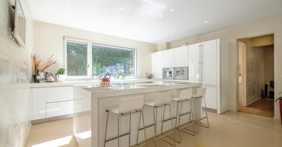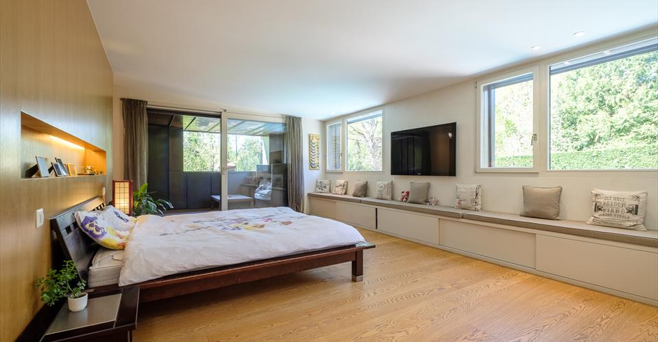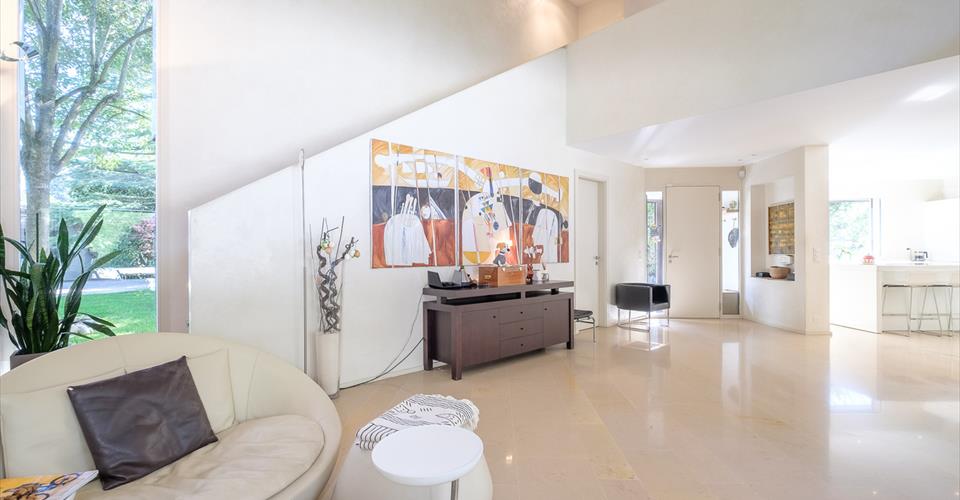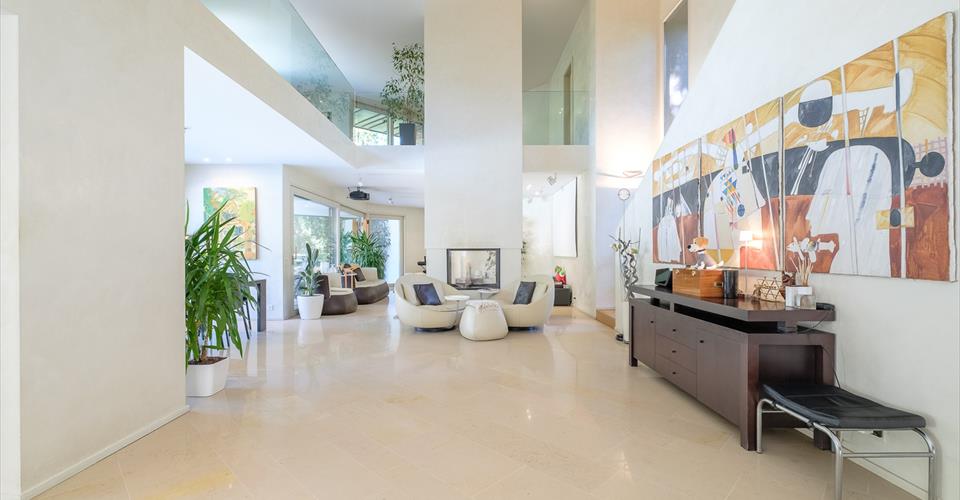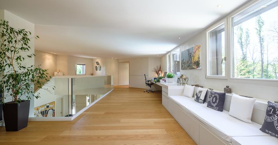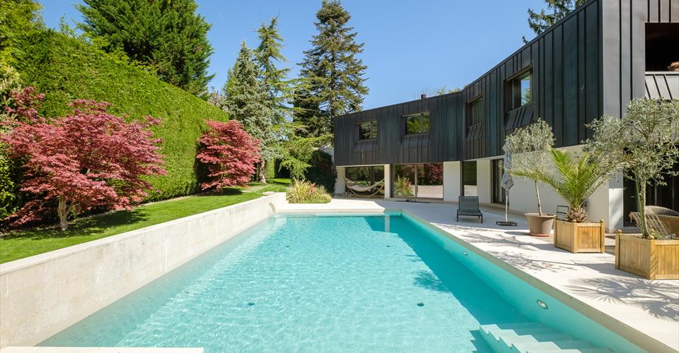Niché au cœur de Conches, un des quartiers les plus prisés de Genève, cette propriété d’architecte offre un cadre de vie paisible dans un environnement verdoyant et sans nuisance. Erigée sur une parcelle très privative de 1875 m², la maison a été édifiée en 2011 et se caractérise par ses grandes ouvertures et ses magnifiques volumes. La propriété se compose de la maison principale et d’un studio indépendant. Le rez-de-chaussée recoit un magnifique double séjour agrémenté d’une cheminée centrale et d’une grande cuisine ouverte entièrement équipée. Toutes ces pièces ont accès à la terrasse du jardin. Le rez reçoit également deux chambres se partageant une salle de bains. Au premier étage se trouve une très belle suite parentale avec hammam et jacuzzi, un dressing monsieur et un dressing madame. La master profite d’un balcon privatif offrant une vue imprenable sur le jardin. Sur le palier, un très bel espace utilisé comme bureau pourrait être transformé pour accueillir une chambre supplémentaire. Le sous-sol reçoit une salle de jeux, deux pièces avec salle de bains, une cuisine et une cave à vin. Le jardin à la végétation luxuriante accueille une piscine chauffée de 14 mètres sur 6, une cuisine d’été et un magnifique espace bien-être avec sauna et bain froid. Enfin, un garage pour deux voitures complète ce magnifique objet.