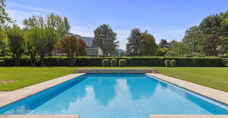 Nichée sur une magnifique parcelle d’environ 3’400 m², cette demeure de style moderne construite en 1984 séduit par son élégance et son confort. Développant environ 580 m² habitables et une surface utile totale de près de 1’050 m², elle offre de généreux volumes et une organisation harmonieuse, pensée pour la vie de famille comme pour la réception. Le rez-de-chaussée accueille un vaste hall d’entrée avec vestiaire et toilettes visiteurs, un bureau indépendant, une salle à manger séparée, un double salon dont l’un avec cheminée ouvrant sur le jardin, ainsi qu’un salon de lecture. Une grande cuisine contemporaine avec îlot central et espace repas complète cet étage. À l’étage, la suite parentale profite d’un superbe dressing et d’une salle de bains complète. Trois autres chambres, toutes équipées d’armoires encastrées et de salles de bains attenantes, viennent parfaire l’espace nuit. Le sous-sol, entièrement aménagé et baigné de lumière grâce à ses baies vitrées avec accès au jardin, propose une vaste salle de jeux, une buanderie-lingerie, un local technique avec chaufferie, un espace de rangement polyvalent, une cave à vin ainsi qu’un abri anti-atomique. À l’extérieur, une grande cour d’entrée avec portail automatique distribue les garages et places de stationnement. Le jardin soigneusement paysagé et clos accueille une superbe piscine chauffée de 15 m x 7,5 m. Un pool-house / maison d’invités complète ce bien d’exception. Il dispose, au rez-de-chaussée, de trois pièces polyvalentes pouvant servir de chambres, de bureau ou de salle de jeux, ainsi que d’une salle de bains. Le sous-sol abrite une cave à vin, un local technique pour la piscine et une chaufferie. L’ensemble constitue une propriété rare et harmonieuse, où chaque détail a été pensé pour offrir confort, espace et raffinement.