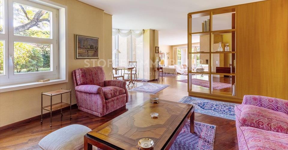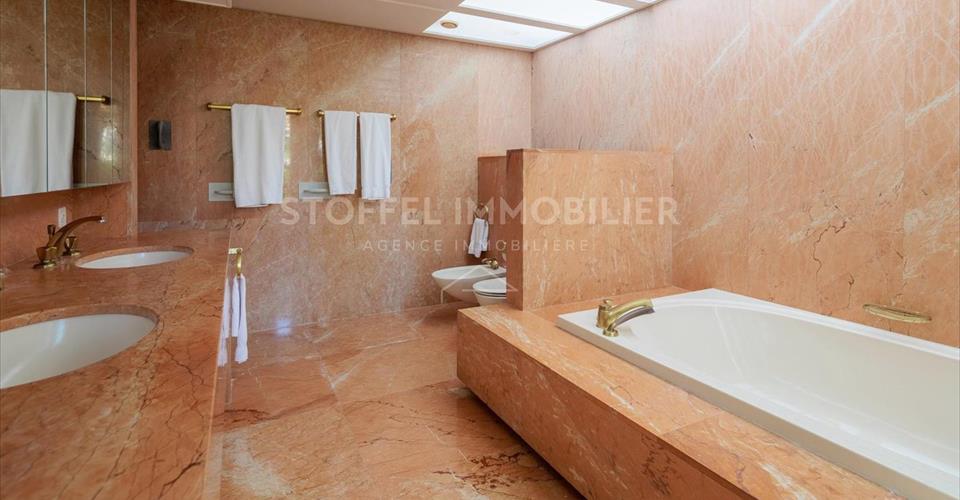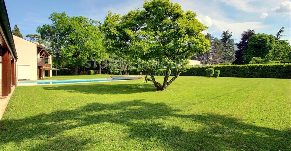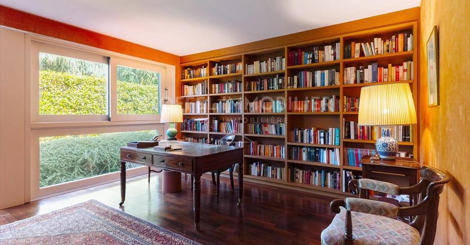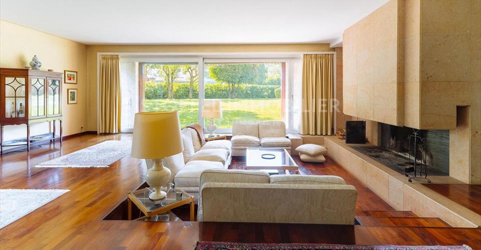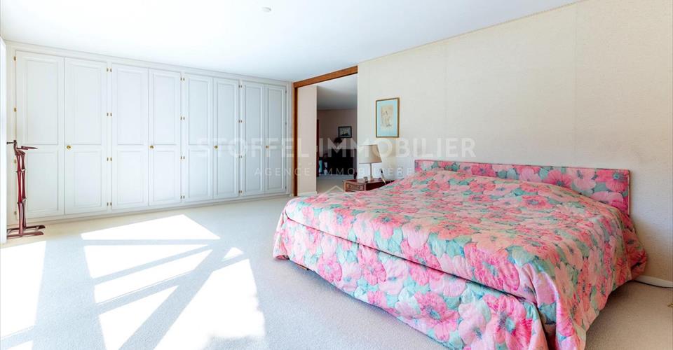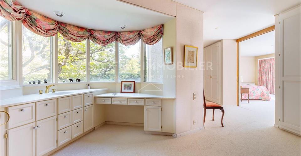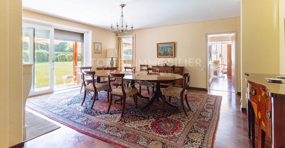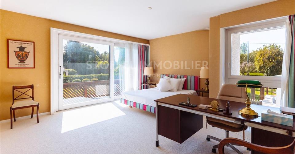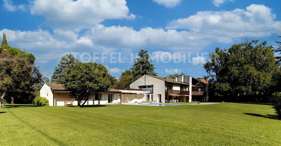 Cette propriété, accessible par un chemin sans issue, est située dans le charmant hameau de Villette. Elle profite d’un environnement calme, tout en étant proche des commerces de Florissant, des transports publics, ainsi que du centre-ville de Genève. Cette spacieuse demeure d’architecture moderne, construite en 1984, offre une surface habitable de 580 m² et une surface utile de 1’050 m². Elle se compose de neuf pièces spacieuses et lumineuses, offrant un cadre de vie agréable et convivial, incluant un double salon, une salle à manger, une cuisine avec espace repas, un bureau ainsi qu’une vaste chambre “Master” et quatre chambres avec salles de bains attenantes. Le sous-sol comprend une salle de jeux et les locaux usuels. La parcelle d’une surface de 3’350 m², orientée plein sud, est soigneusement paysagée. Elle dispose d’un vaste jardin, d’une grande piscine et d’une maison d’invités. Une belle cour d’entrée agrémentée de garages et de places de parking vient parfaire l’ensemble. Vente en nom Disponibilité à convenir