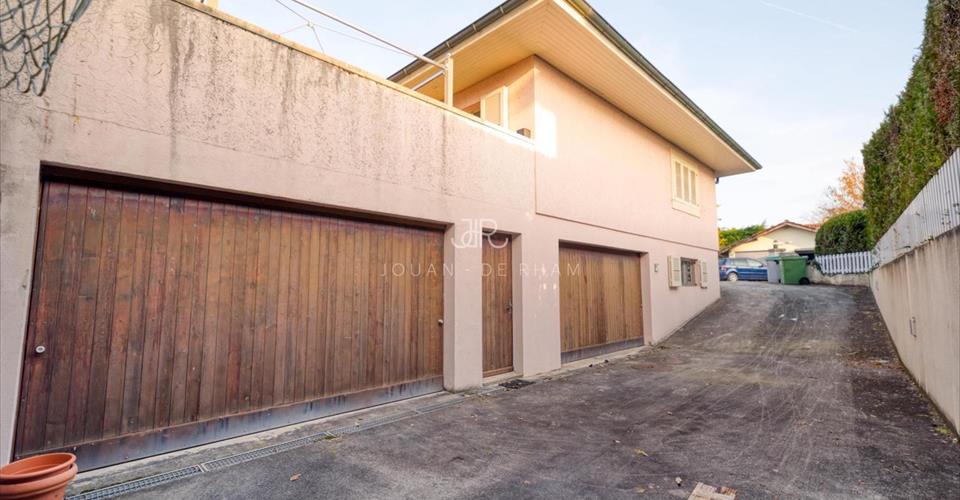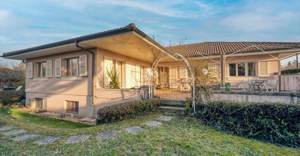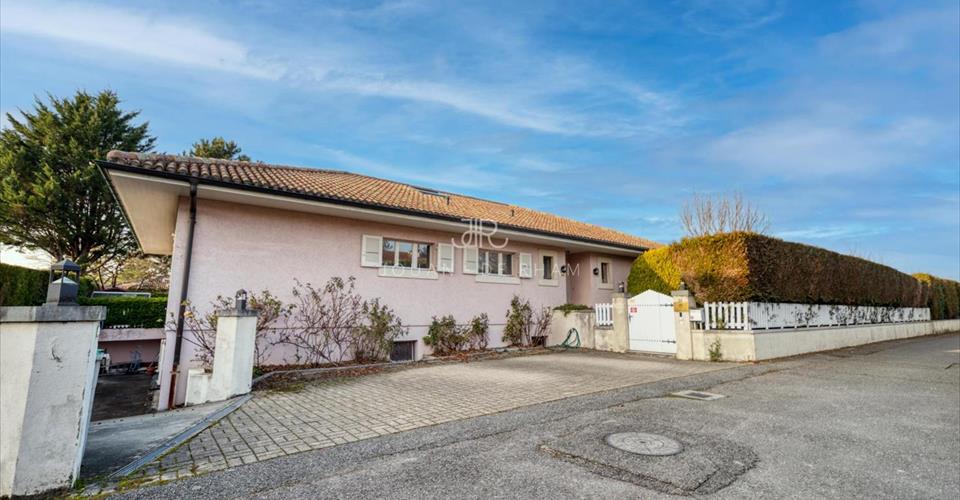 Jouan – de Rham a le plaisir de vous présenter cette belle maison individuelle de plain-pied, idéalement située au coeur de Vésenaz. Érigée sur une parcelle de près de 1’200 m², cette propriété offre une surface utile d’environ 550 m² et bénéficie d’un cadre résidentiel calme et verdoyant, tout en restant à proximité immédiate de toutes les commodités. Le rez-de-chaussée se compose d’un vaste séjour/salle à manger en « L », d’une grande cuisine familiale ainsi que d’un WC invités. La partie nuit accueille une suite parentale avec sa salle de bains privative (baignoire, douche et WC) ainsi que trois chambres supplémentaires partageant une salle de bains (baignoire et WC). Le sous-sol dispose de généreux espaces avec une chambre et sa salle de bains attenante, une seconde salle d’eau avec WC, un studio indépendant avec cuisine, un espace fitness avec sauna, une buanderie, plusieurs pièces de rangement ainsi que les locaux techniques. Un vaste garage pour 4 véhicules complète ce niveau. Une rénovation complète est à prévoir, offrant à ses futurs propriétaires une superbe opportunité de repenser et personnaliser cette maison familiale selon leurs envies. Il existe également d’importantes possibilités pour aménager le premier étage, sous les toits.