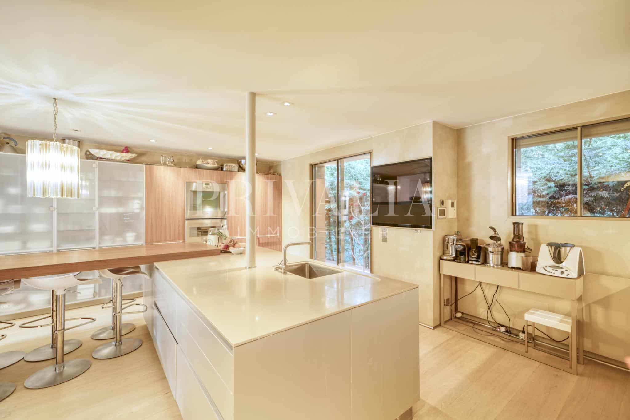 – Cuisine moderne entièrement équipée avec îlot central et appareils électroménagers de qualité, ouverte sur la salle à manger.