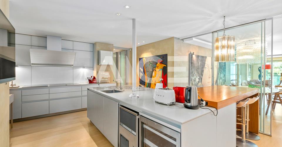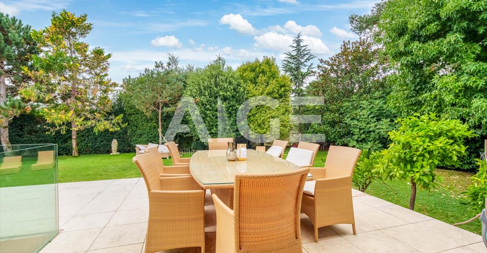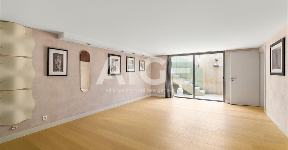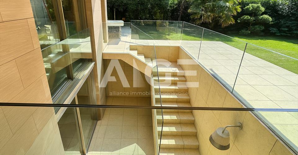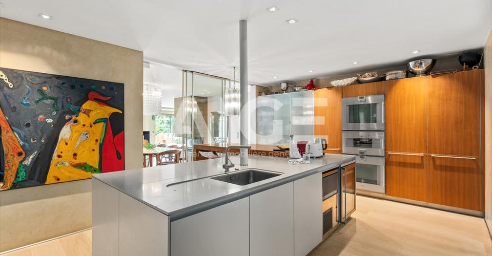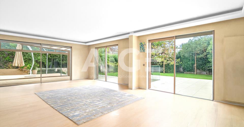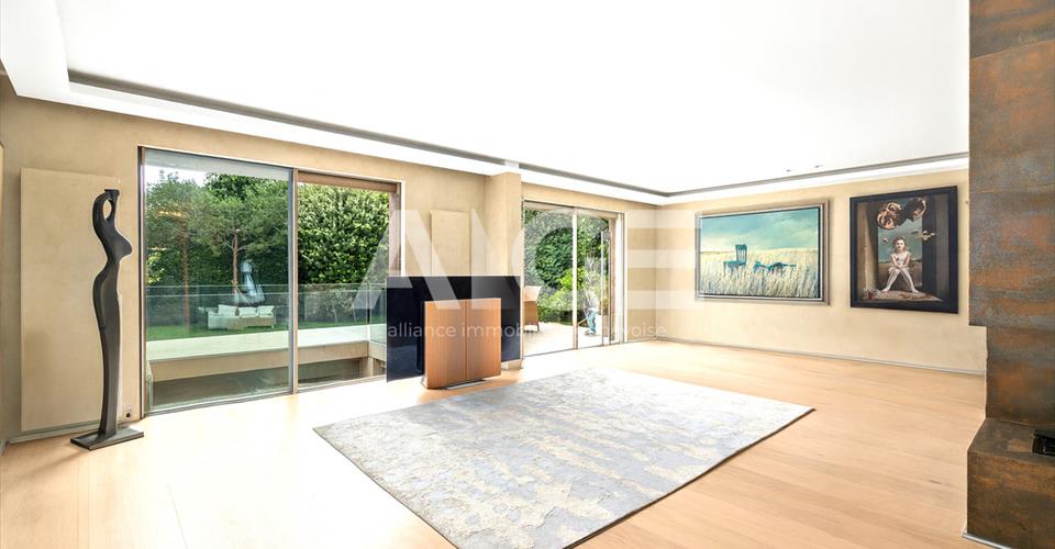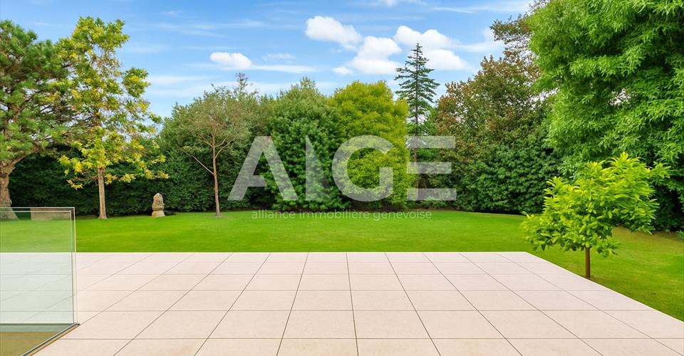 Située dans un environnement exclusif sur la commune de Cologny, au sein du très prisé Triangle d’Or formé par Chêne-Bougeries, Vandoeuvres et Cologny, cette magnifique villa de plain-pied bénéficie d’une situation exceptionnelle, en bout d’un chemin privé sans issue, garantissant une tranquillité absolue. Entièrement rénovée en 2015 avec des matériaux haut de gamme, la propriété a été repensée dans ses volumes afin d’offrir des espaces de vie généreux, harmonieux et baignés de lumière. Toutes les pièces, y compris les chambres, bénéficient d’un accès direct à la terrasse et au jardin, favorisant une continuité intérieur-extérieur particulièrement agréable. Surface d’environ 440 m² répartie sur deux niveaux : Rez-de-chaussée : Hall d’entrée en demi-niveau Spacieux séjour/salle à manger avec cheminée centrale Grande cuisine ouverte avec îlot central, équipée en double (électroménager Gaggenau), pouvant être fermée grâce à de grandes baies vitrées 4 chambres à coucher avec rangements intégrés et dressing 3 salles de douches avec WC Terrasse avec véranda rétractable, permettant de profiter de l’extérieur en toute saison Rez inférieur (accès indépendant depuis le jardin) : Grand studio lumineux avec kitchenette, chambre, salle de douche/WC, et accès à une terrasse anglaise Une chambre supplémentaire avec salle de douche attenante Buanderie Cave à vin Local technique (installations électriques) Pièce de rangement et cave Terrasse anglaise apportant lumière naturelle à l’ensemble du niveau inférieu À proximité, un magnifique spa de nage à contre-courant en mosaïque est aménagé dans une pièce mitoyenne à la villa, avec accès direct au jardin. Extérieurs : La propriété bénéficie d’un jardin joliment paysagé, agrémenté de nombreuses essences d’arbres, d’un jacuzzi, ainsi que d’un carport pouvant accueillir 3 à 4 véhicules. Un grand portail coulissant ouvre sur une vaste cour pavée offrant plusieurs places de stationnement.