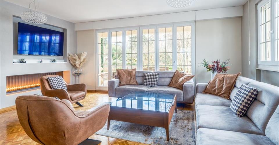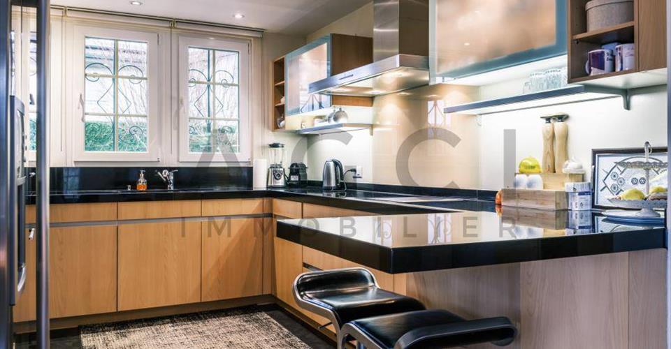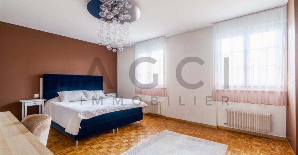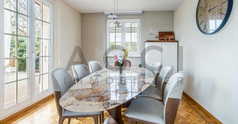 Une villa individuelle de 240 m² habitables et de 420 m² utiles, située dans un quartier résidentiel de Vernier, proche de Genève. Entourée de zones vertes et bien desservie par les transports publics, elle offre un accès facile aux commodités locales. Elle se distribue comme suit : Rez-de-chaussée : – Un hall d’entrée – Une cuisine semi-ouverte – Une salle à manger avec accès à la terrasse – Un salon avec cheminée et accès à la terrasse – Deux grandes chambres – Une petite chambre – Une chambre avec dressing et salle de bains incluant une baignoire, une douche, un WC et une vasque – Une salle d’eau avec douche à l’italienne, WC, vasque et sèche-serviettes – Un WC séparé avec vasque Premier étage : – Une grande salle de jeux – Une grande chambre avec dressing et salle d’eau incluant une douche, une baignoire, un WC et une vasque Sous-sol : – Une salle de sport avec WC et vasque – Un local technique avec une pompe à chaleur (2023) – Une buanderie – Un grand abri – Un garage pour deux voitures Annexes : – Pompe à chaleur – Terrain entièrement clôturé et abrité – Une terrasse en pierre naturelle – Une terrasse semi-couverte Extérieur : – Piscine chauffée – Potager – Clôturé et arboré – Terrasse couverte – Terrasse