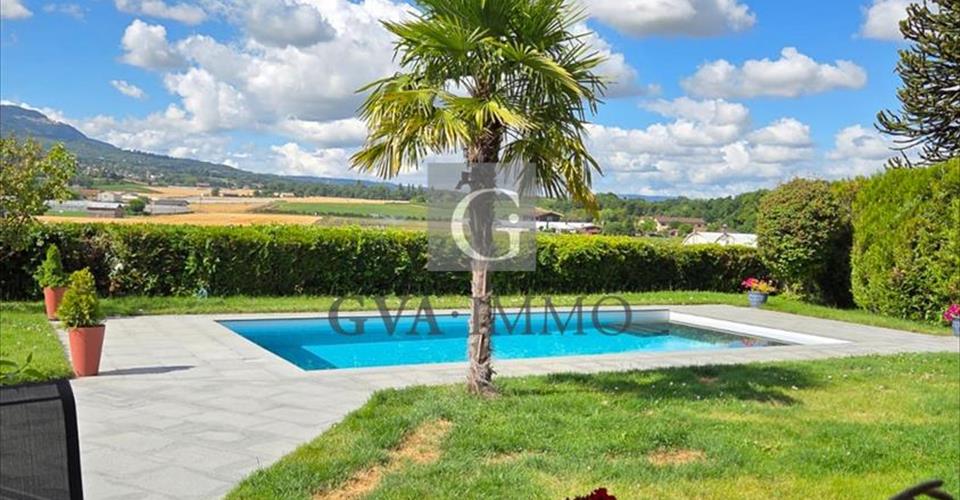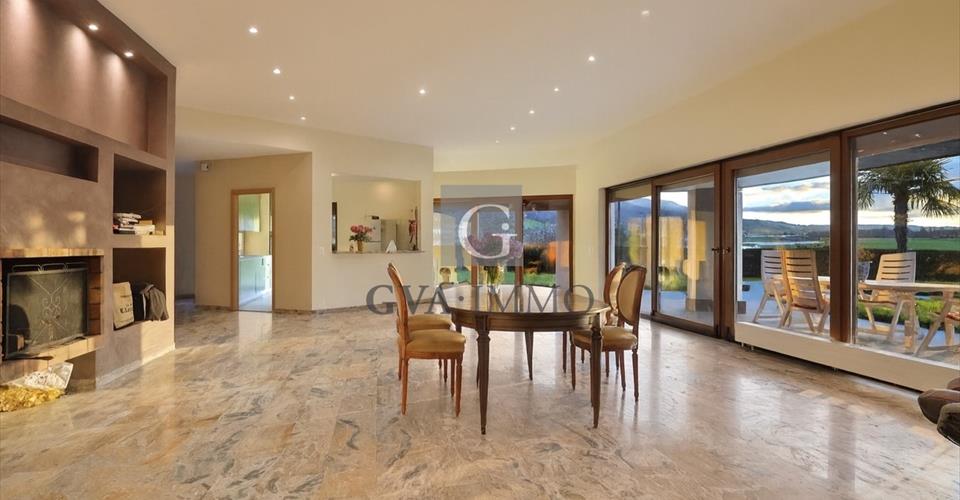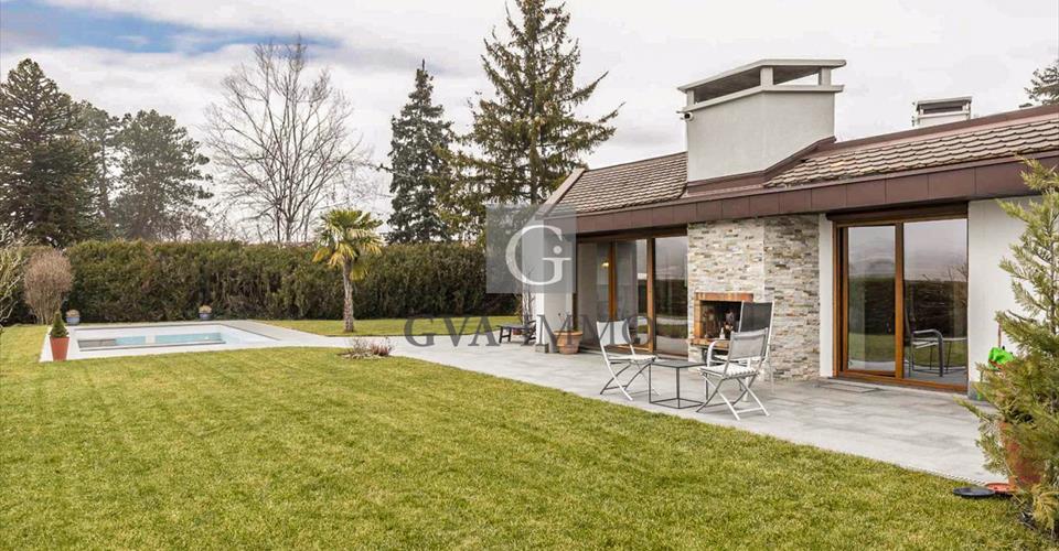Idéalement située dans un environnement résidentiel, en bordure de zone agricole offrant une large vue sur la campagne environnante, cette superbe villa indépendante bénéficie d’un cadre de vie privilégié. Édifiée sur une parcelle d’environ 1’250 m², la propriété séduit par son jardin entièrement clôturé, sa grande terrasse ensoleillée et sa magnifique piscine, idéale pour profiter des beaux jours. Entièrement rénovée avec des matériaux de qualité, la villa offre environ 190 m² habitables pour 380 m² utiles, répartis sur deux niveaux. Le rez-de-chaussée se compose d’un hall d’entrée, d’un vaste séjour avec cheminée et accès direct à la terrasse et au jardin, ainsi que d’une belle cuisine semi-ouverte. Cet espace de vie jouit de la magnifique vue sur la campagne. L’espace nuit propose une suite parentale avec dressings et salle de bains en suite ainsi que deux autres chambres à coucher avec une salle de douche. Le niveau inférieur, lumineux grâce à ses ouvertures sur l’extérieur, accueille deux grandes chambres supplémentaires, une grande pièce polyvalente (salle de jeux, home cinéma, fitness), une salle de bains ainsi qu’un espace bien-être avec sauna. Une buanderie, une cave à vin, un local technique et la salle de filtration de la piscine complètent cet étage. Un garage ainsi que 4 places de parc extérieures viennent parfaire ce bien rare sur le marché. À noter : plusieurs possibilités d’agrandissement sont envisageables, offrant un beau potentiel d’évolution selon vos besoins.