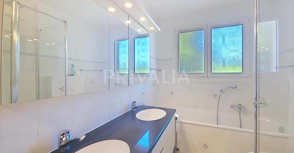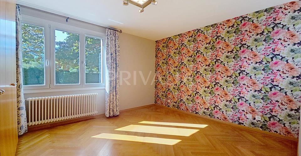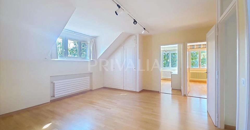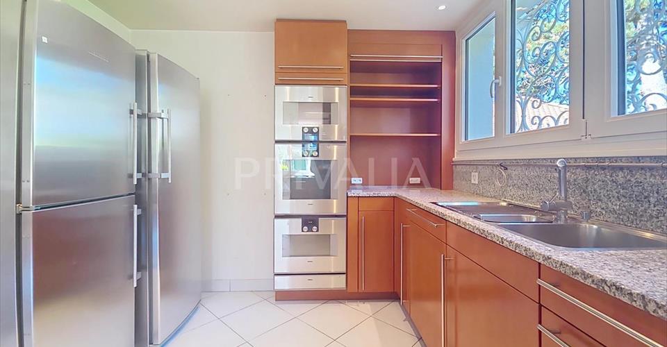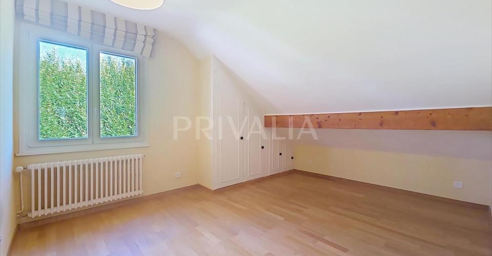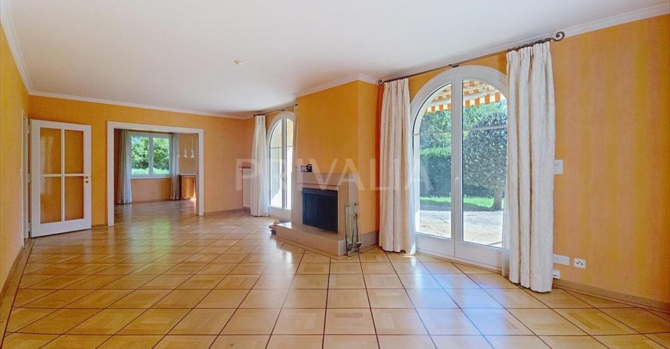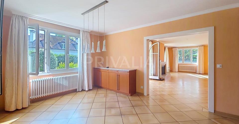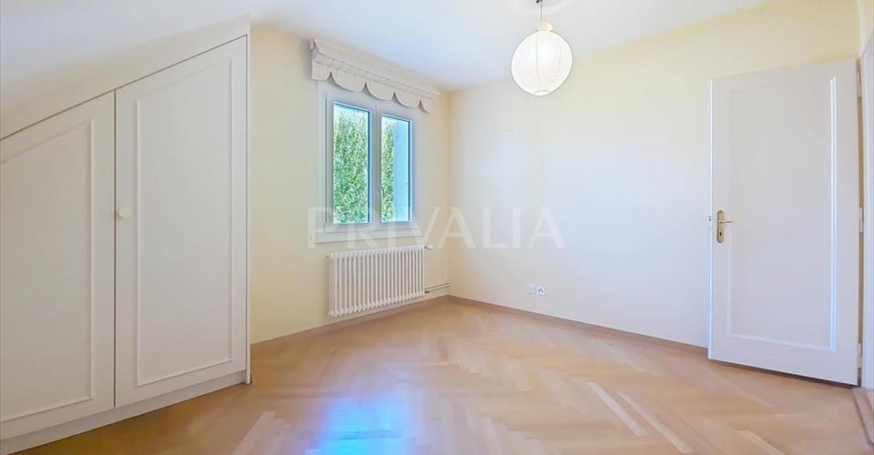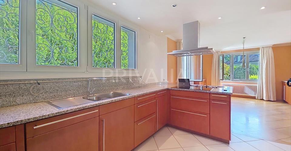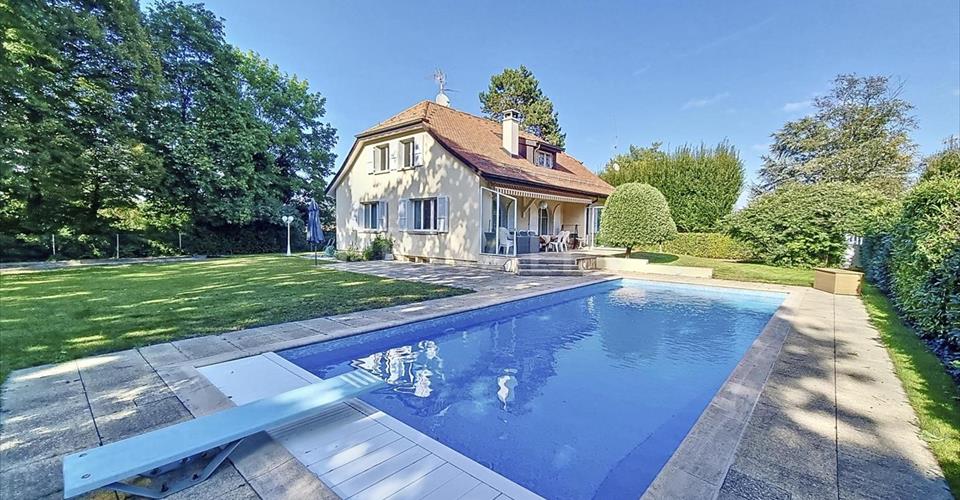 Située sur la commune de Thônex, dans un chemin privé calme et résidentiel sans issue, cette jolie villa individuelle d’environ 220 m2 habitable, dispose de 9 pièces, dont 5 chambres à coucher, sur une parcelle arborée de plus de 1’360 m2. Cette villa, entretenue avec soin, offre une distribution fonctionnelle, idéale pour une y accueillir une grande famille, ainsi que des prestations des qualité. Elle profite notamment de grandes pièces à vivre, nombreuses chambres à coucher, cuisine entièrement équipée et agencée, cheminée fonctionnelle, parquet de style ancien, spacieux sous-sol avec salle de jeux, nombreux espaces de rangements ou encore un magnifique jardin arboré et clôturé comprenant deux espaces terrasses ainsi qu’une piscine chauffée et un terrain de pétanque. Erigée sur trois niveaux, elle se distribue comme suit : Rez-de-chaussée : – Spacieux hall d’entrée – Séjour avec cheminée accès terrasse – Salle à manger – Cuisine ouverte agencée et équipée – Chambre parentale avec sa salle de bains / douche avec WC attenante – WC visiteurs 1er étage : – 4 chambres à coucher – Salle de bains / douche avec WC – Pièce polyvalente centrale donnant sur les chambres à coucher Sous-sol : – Spacieuse pièce polyvalente (salle de jeux, chambre d’amis, etc) – Cave / buanderie – Local technique (chaudière à mazout) Un magnifique jardin clôturé et arboré, une belle piscine chauffée, deux espaces terrasses, une grande cour avec portail électrique pouvant accueillir plusieurs véhicules et un garage extérieur pour deux voitures viennent compléter l’ensemble. Cette propriété se situe à proximité immédiate de toutes les commodités de Thônex, où se trouvent notamment des supermarchés, la poste, un centre commercial, ou encore de nombreux restaurants. Les transports publics (bus C, C+, NK) ou encore le tram 12 (arrêts « Graveson » et « Moillesulaz ») ainsi que le CEVA desservent le centre-ville de Genève en 15 minutes. La voie verte est à quelques minutes à pied de la propriété et permet également de rejoindre le centre ville en une dizaine de minutes. Les écoles, dont le cycle du Foron, sont à quelques minutes.