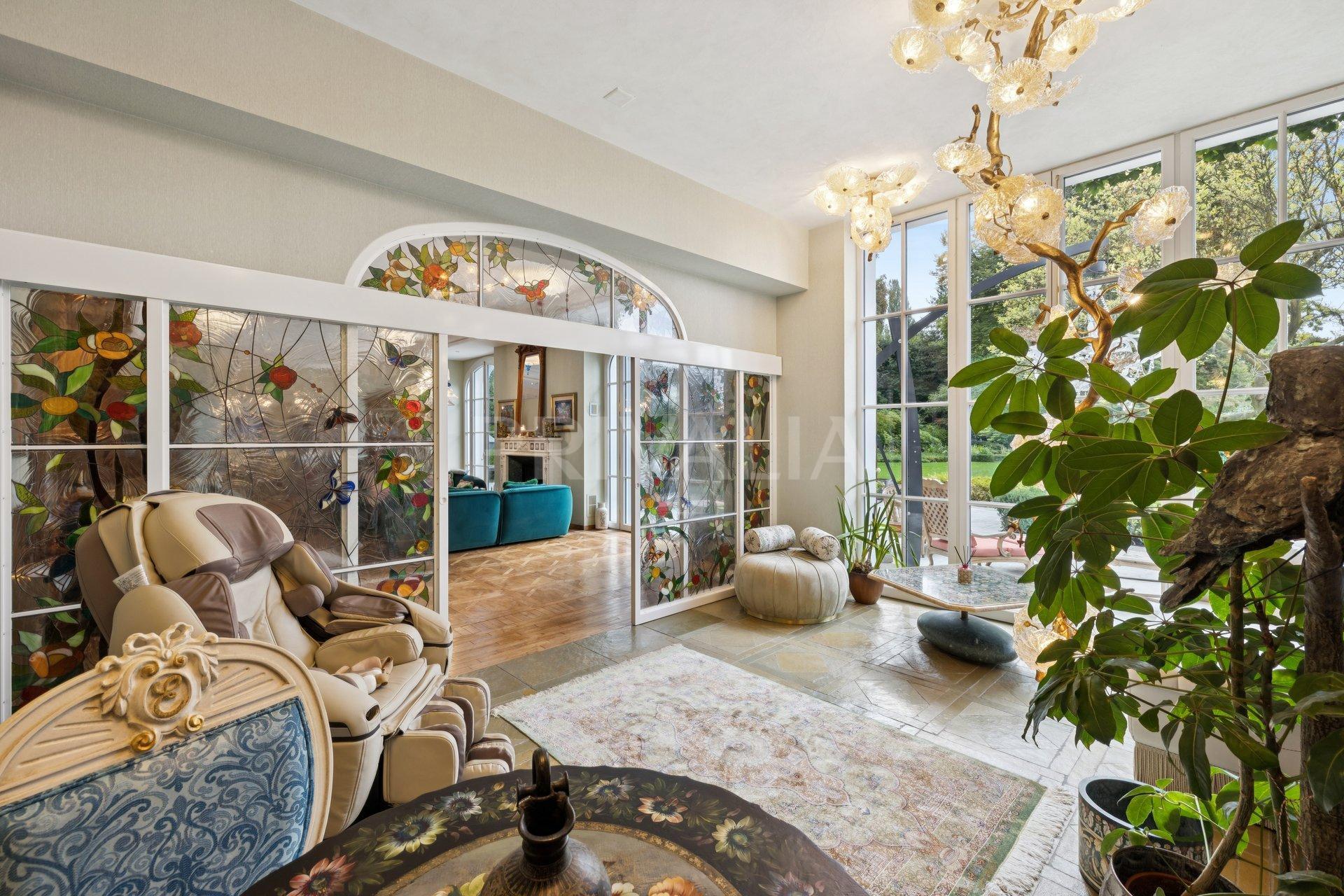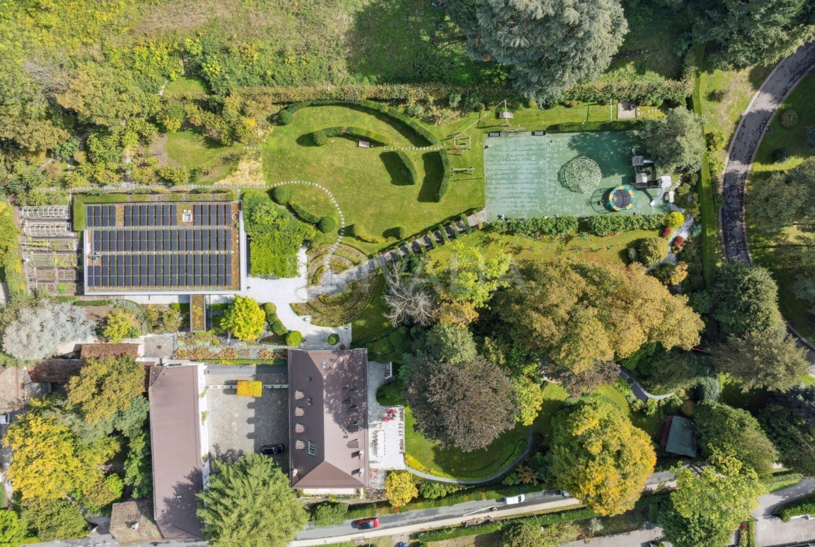 Édifiée sur un parc paysager d’un hectare, elle propose plus de 1’500 m² habitables répartis sur plusieurs bâtiments. Le parc comprend un jardin raffiné, une aire de jeux, ainsi qu’un pavillon japonais entouré d’essences rares.