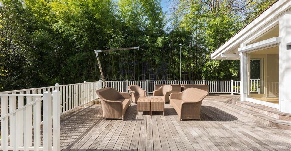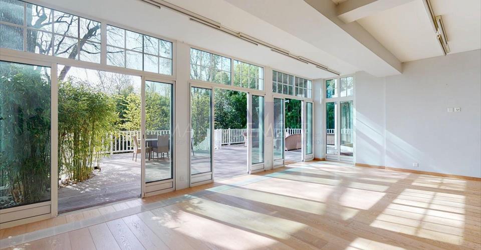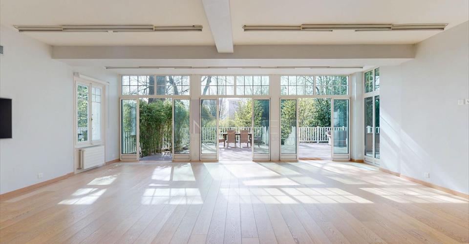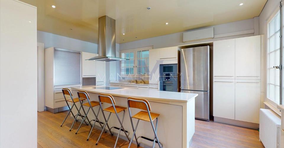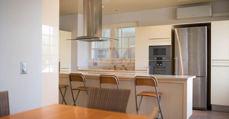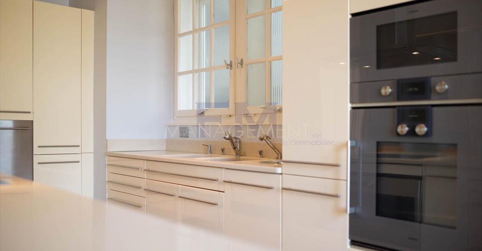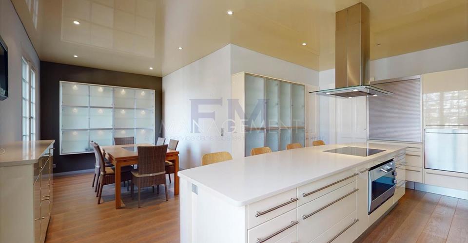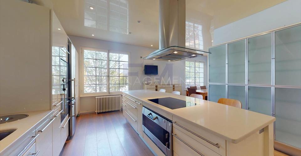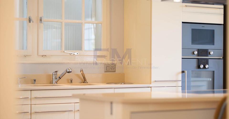 Ravissante Villa familiale individuelle de 9 pièces, d’environ 350 m2 habitables. Érigée sur une belle parcelle arborée, dans un cadre verdoyant à l’abri des nuisances et des regards, cette ravissante propriété offre d’agréables extérieurs aux aménagements soignés. Construite dans un style architectural classique, cette villa offre de beaux volumes dans un cadre idéal pour recevoir. La villa a été entièrement rénovée en 2016, dans un style raffiné maintenant le caractère et le charme de la bâtisse. L’élégant hall d’entrée avec vestiaire et toilettes visiteurs mène vers un grand salon très lumineux et à la grande terrasse dominant le jardin. Une cuisine équipée avec sa salle à manger complète l’étage. Le premier étage est dédié à l’espace nuit et dispose de deux grandes chambres en suite avec sa salle de bains/douche, ainsi que de deux chambres à coucher partageant une salle de douche. Le sous-sol, entièrement excavé, dispose des habituelles pièces techniques et de rangement, mais également d’une grande salle de jeux avec lumière naturelle, d’une cave à vin et d’un atelier. En annexe attenante à la villa (par entrée indépendante), logement ou espace professionnel est composé d’un hall d’entrée avec toilettes visiteurs, d’une kitchenette équipée, d’un beau séjour avec accès terrasse, d’une chambre et d’une salle de douche. Le joli jardin est entretenu avec soin et bénéficie d’une orientation sud/est. Un garage et une belle cour pavée pouvant accueillir plusieurs voitures complètent cette superbe propriété. Loyer mensuel : CHF 13’500.00 (Charges Individuelles) Disponible immédiatement. Pour tout renseignement ou demande de visite, vous pouvez nous contacter par téléphone. Après votre visite, en cas d’intérêt à louer l’objet, retrouvez l’annonce sur notre site web www.fm-management.ch et cliquez sur le lien “Inscription en ligne” pour soumettre votre dossier d’inscription directement en ligne; ou alors téléchargez le formulaire d’inscription intitulé « demande de location pour appartement » disponible sous l’onglet «formulaires» et, une fois complété, renvoyez-le avec ses annexes à notre adresse.